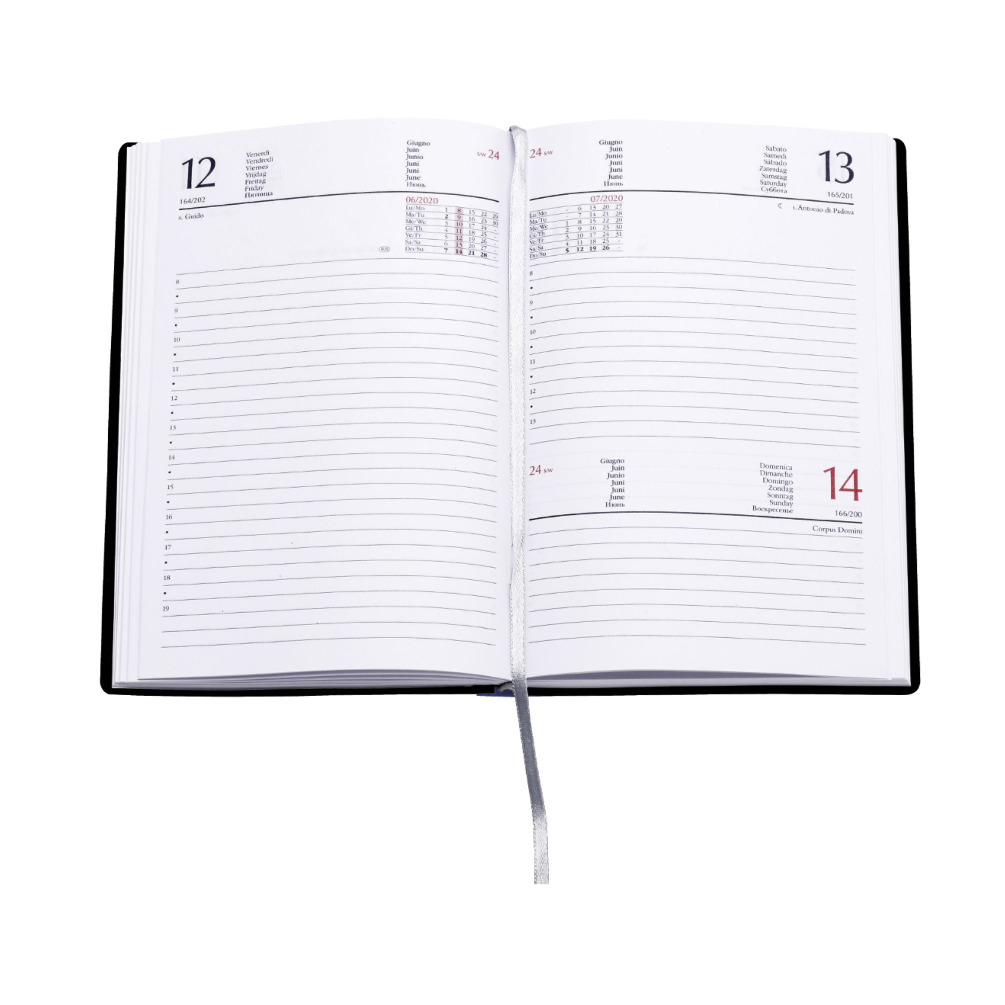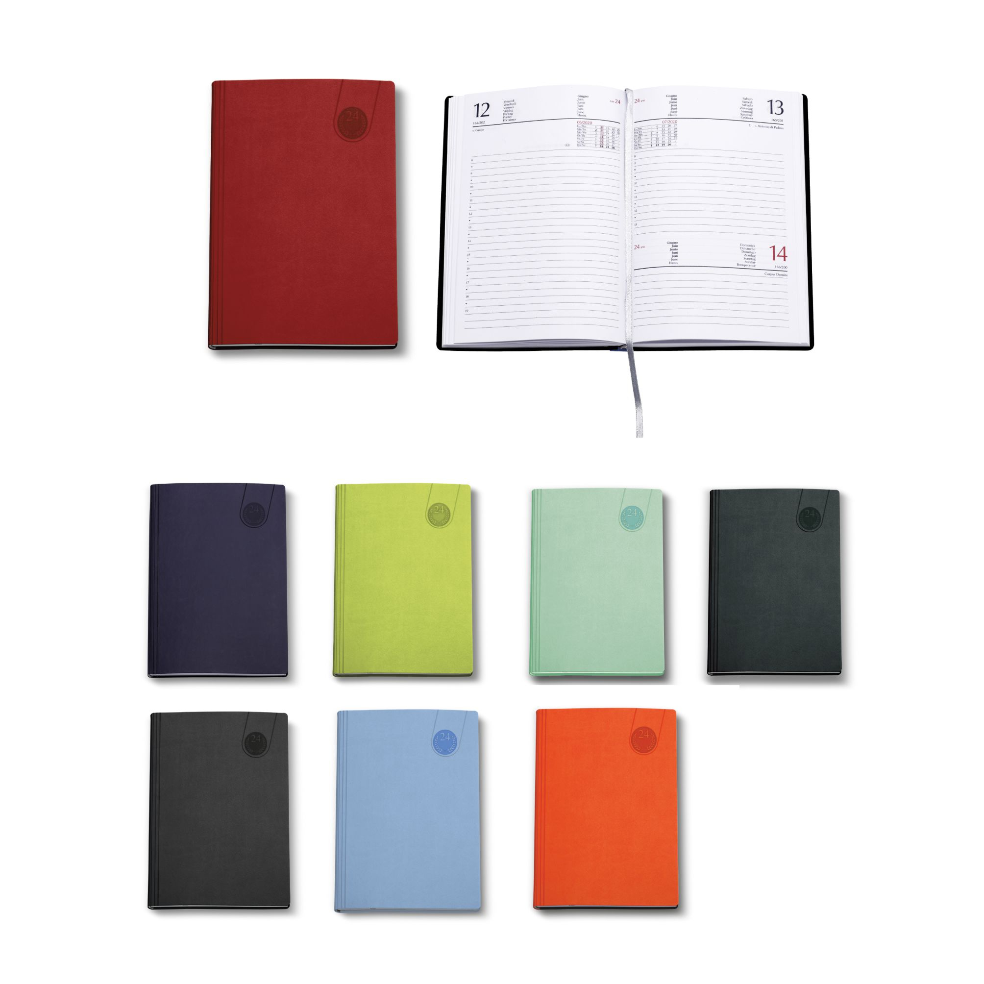 Agenda giornaliera “Tavecchi”.Materiale : printflex termovirante. Interno stampa 2 colori. Multilingue. Carta bianca usomano. Rubrica telefonica. Colori: blu, arancio, verde acido, nero rosso, verde. Dimensioni cm. 11x17