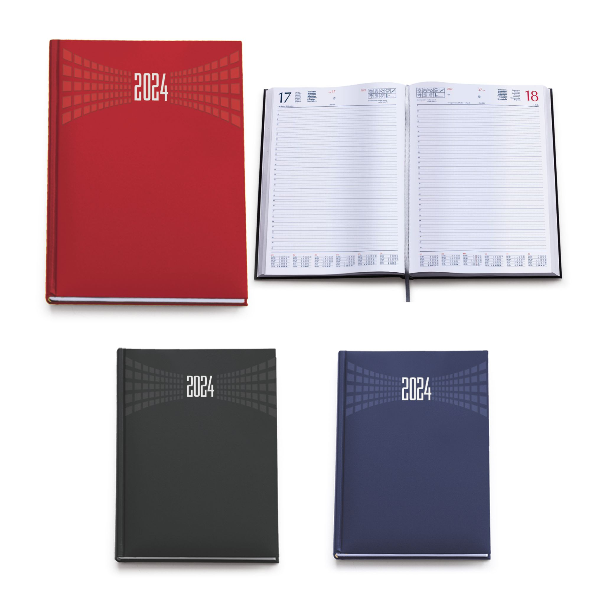 Agenda giornaliera in matra. Interno stampa 2 colori. Multilingue. Pagine 384. Sabato e dome-nica separati, rubrica telefonica, cartina geografica. Pagine perforate per facile strappo. Colori: blu, nero, rosso. Dimensioni cm 21x30