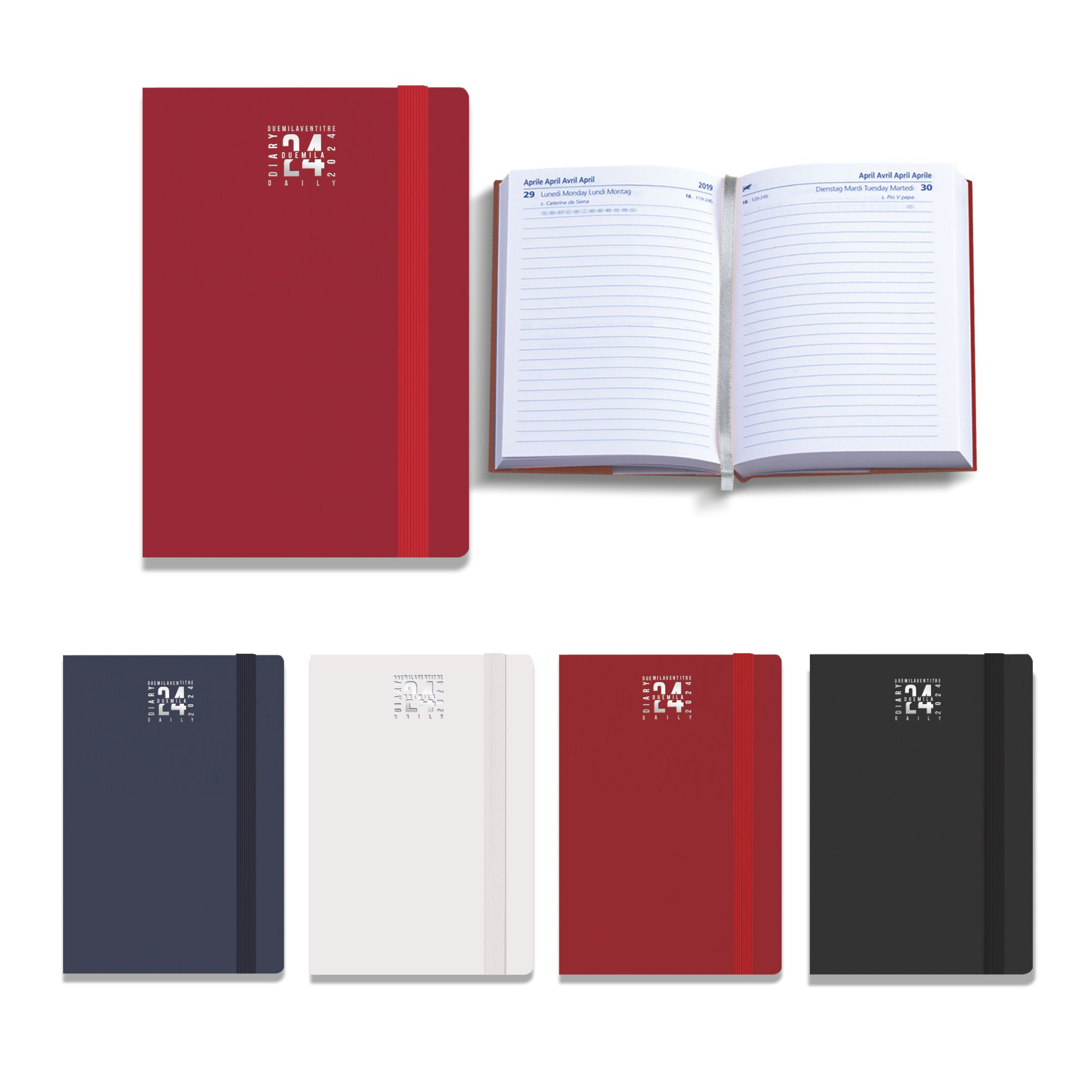 Agendina giornaliera con elastico. Materiale pvc. Interno stampa 1 colore. Carta bianca 80gr. Multi-lingue. Note personali, festività nel mondo, pesi e misure. Segna pagine. Colori: blu, nero, rosso. Dimensioni cm. 9x13 Imballo: 40xcolore