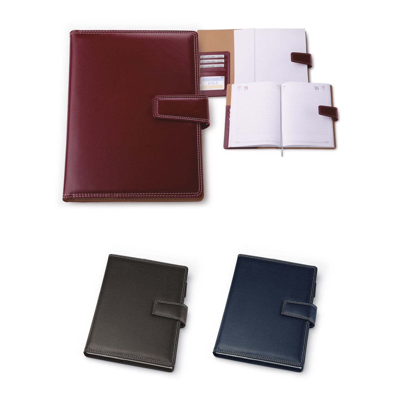 Agenda in similpelle. Vari scomparti porta carte di credito, porta documenti, vano porta penna. Chiusura calamitata. Interno mobile giornaliero (17x24). Stampa 2 colori. Multilingue. Sabato e domenica abbinati, rubrica telefonica, carta bianca. Colori: nero, blu, bordeaux. . Confezione in astuccio. Dimensioni cm 18x25 Imballo: 30xcolore