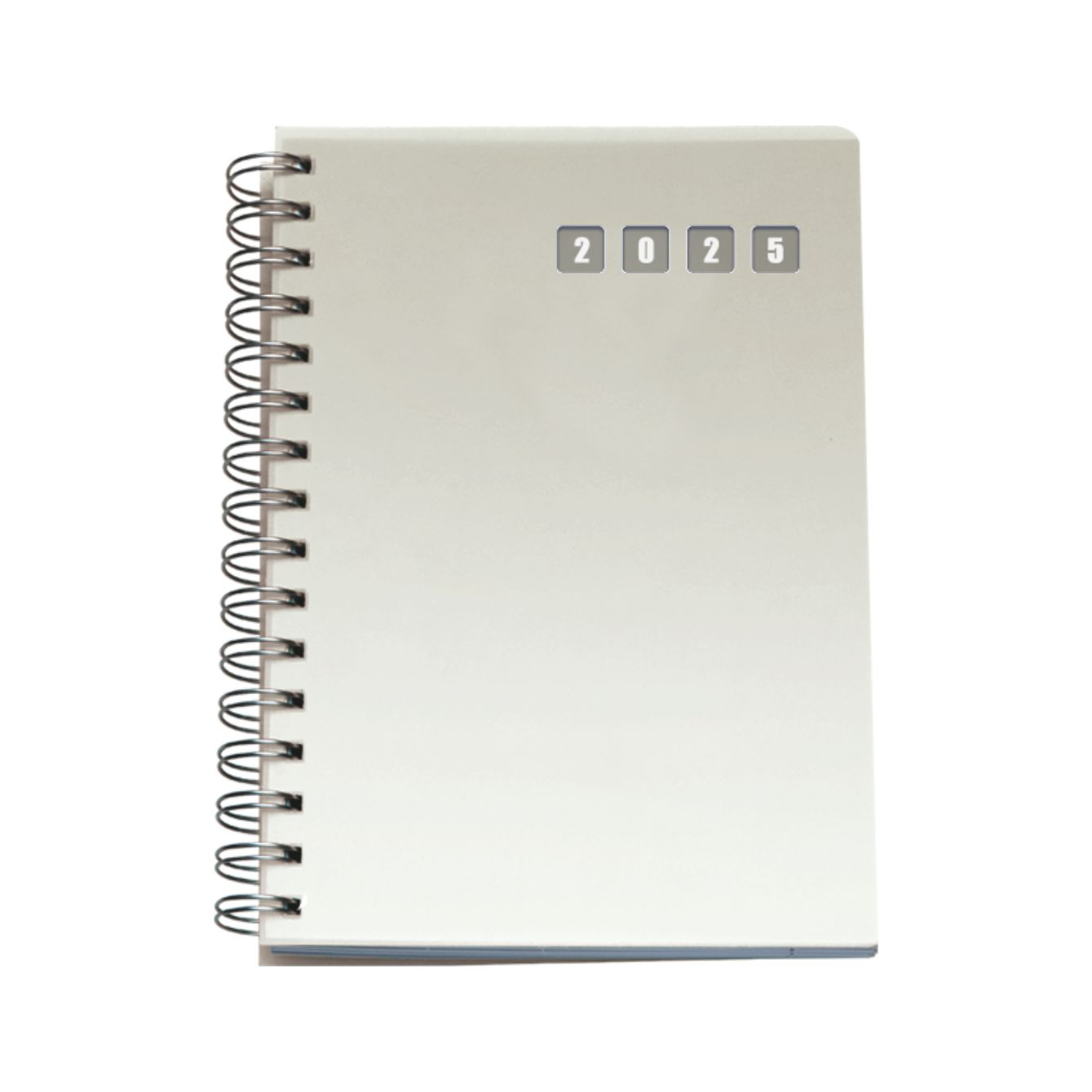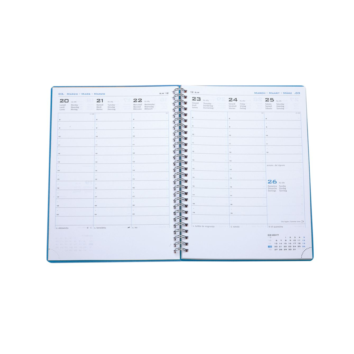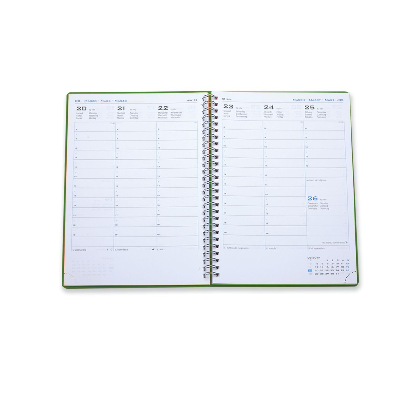 Agenda in polipropilene. Interno settimanale con spirale stampato a 2 colori. Carta bianca, an-golo perforato. Rubrica telefonica stampata. Colori: bianco, rosso, sky, arancio, verde. Fornite senza astuccio. Dimensioni cm. 17x24,5