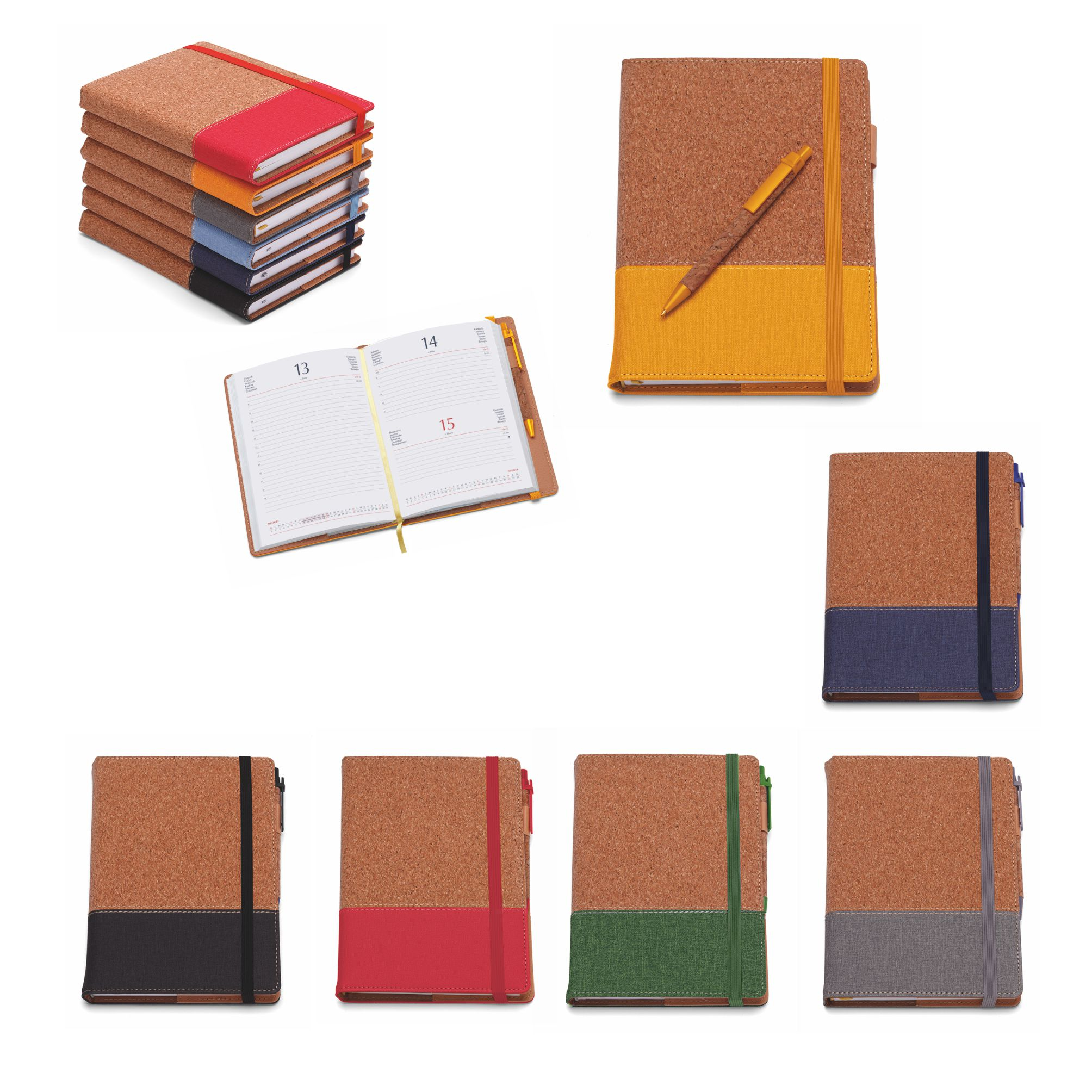 Agenda in PU termovirante e sughero. Chiusa con elastico. Interno mobile (15x21) stampa 2 colori. Multilingue. Rubrica telefonica. Carta bianca 60gr usomano. Penna inclusa. Colori: nero, grigio, verde lime, arancio, blu, rosso. Confezione in astuccio. Dimensioni 15x21 Imballo: 30xcolore