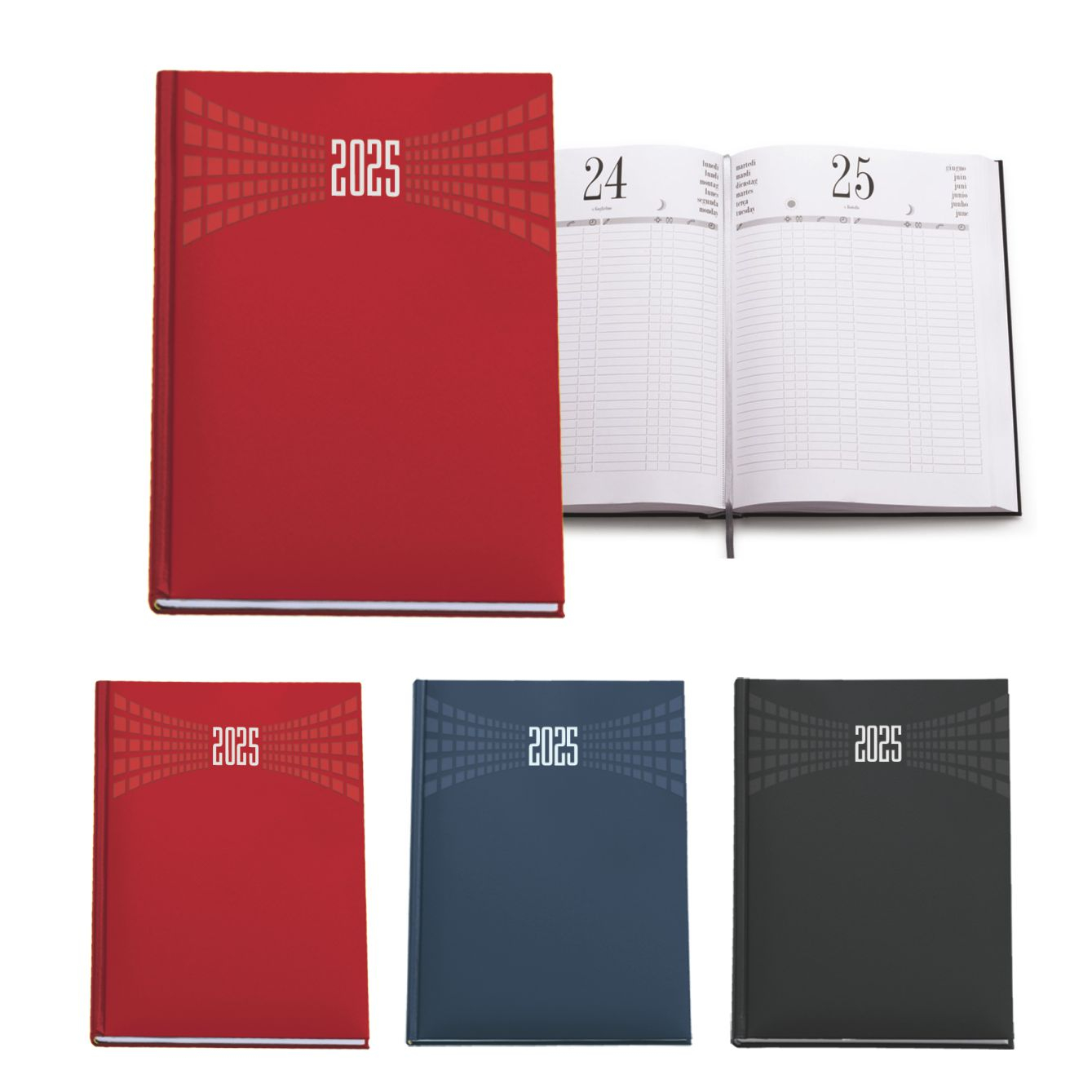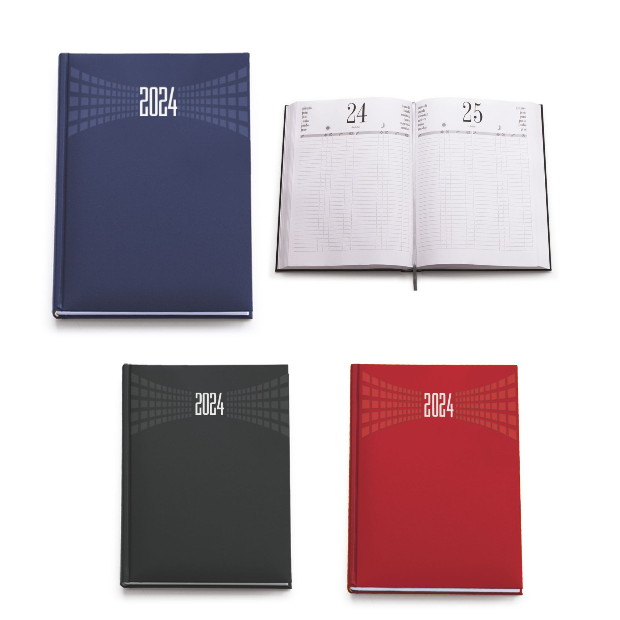 Agenda” Ristorante giornaliera in matra. Interno stampa 2 colori Pag. 576. Multilingue. Ru-brica telefonica, dizionario gastronomico, festività patronali, calendario planning. Pagine perfo-rate per facile strappo. Colori: blu, nero, rosso. Dimensioni cm. 21x30 Imballo: 10xcolore