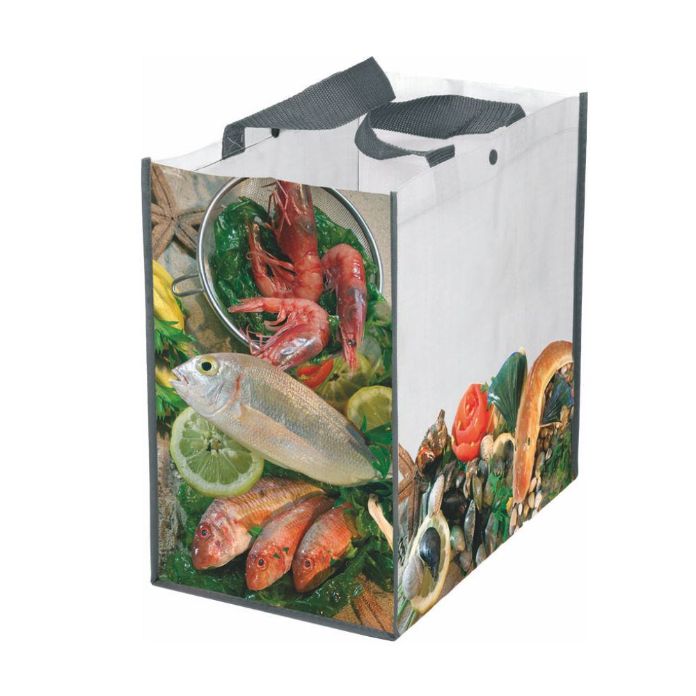 Borsa shopping PP “Pesce”. Doppio manico. Chiusura con bottoncino. Colore unico. Dimensioni cm.35x35x22 Imballo: 100