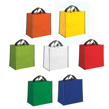 Borsa shopping PP. Doppio manico. Chiusura con bottoncino. Colori: royal, rosso, bianco, ver-de, verde lime, arancio. Dimensioni cm 43x45x24 Imballo: 100xcolore