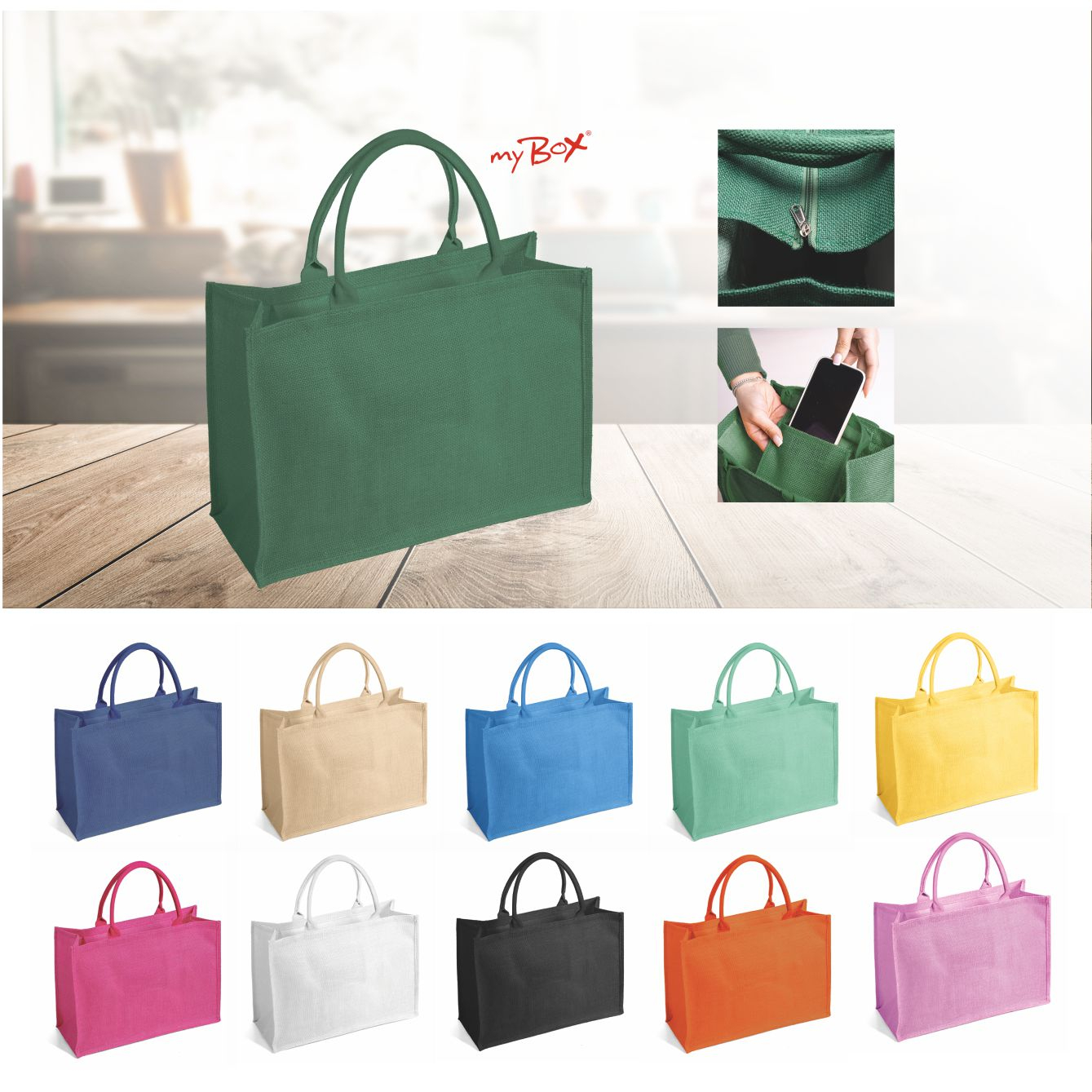 Borsa in juta tinta laminata con manici in corda da 50cm, chiusura zip e taschino interno. Dimensioni: cm 48x34x19.