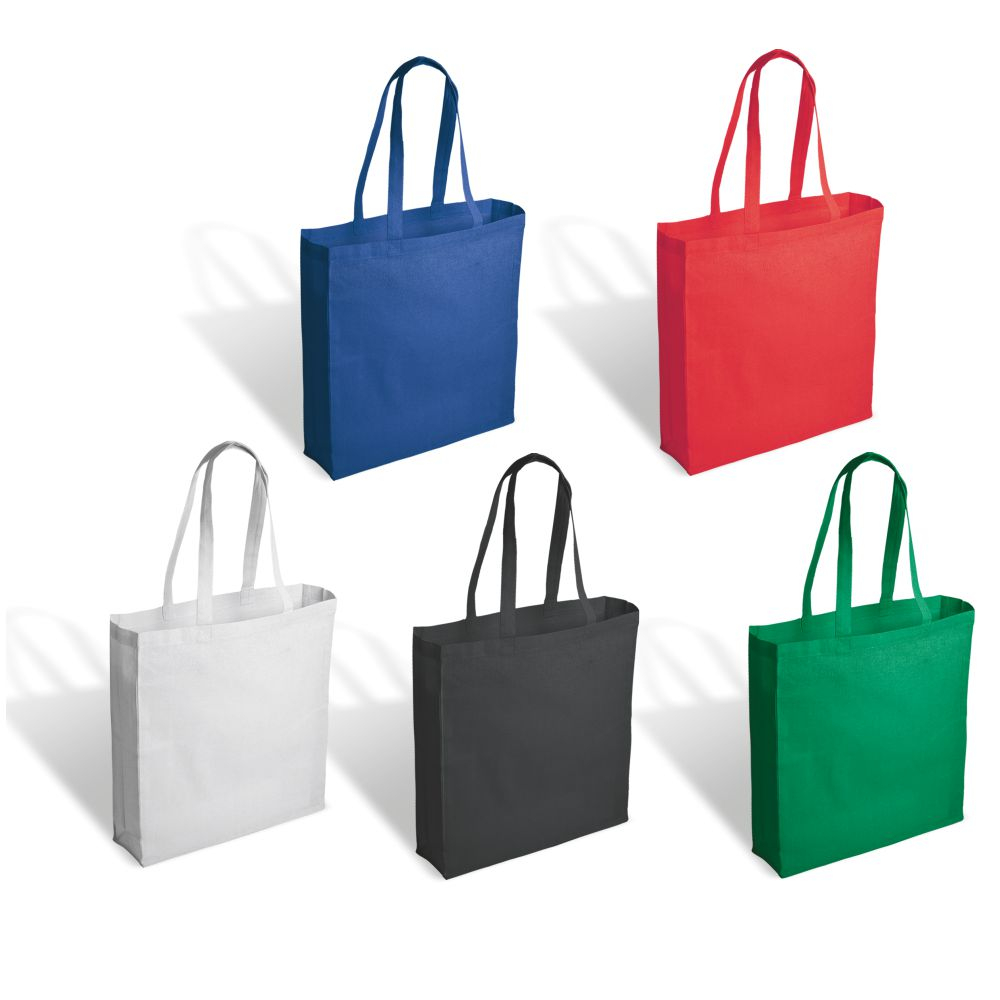 Borsa shopping cotone 130 g/m². Manici lunghi cm. 2,5x60. Colori: royal, rosso, verde, nero, bianco. Dimensioni cm. 38x42x10 Imballo: 100xcolore