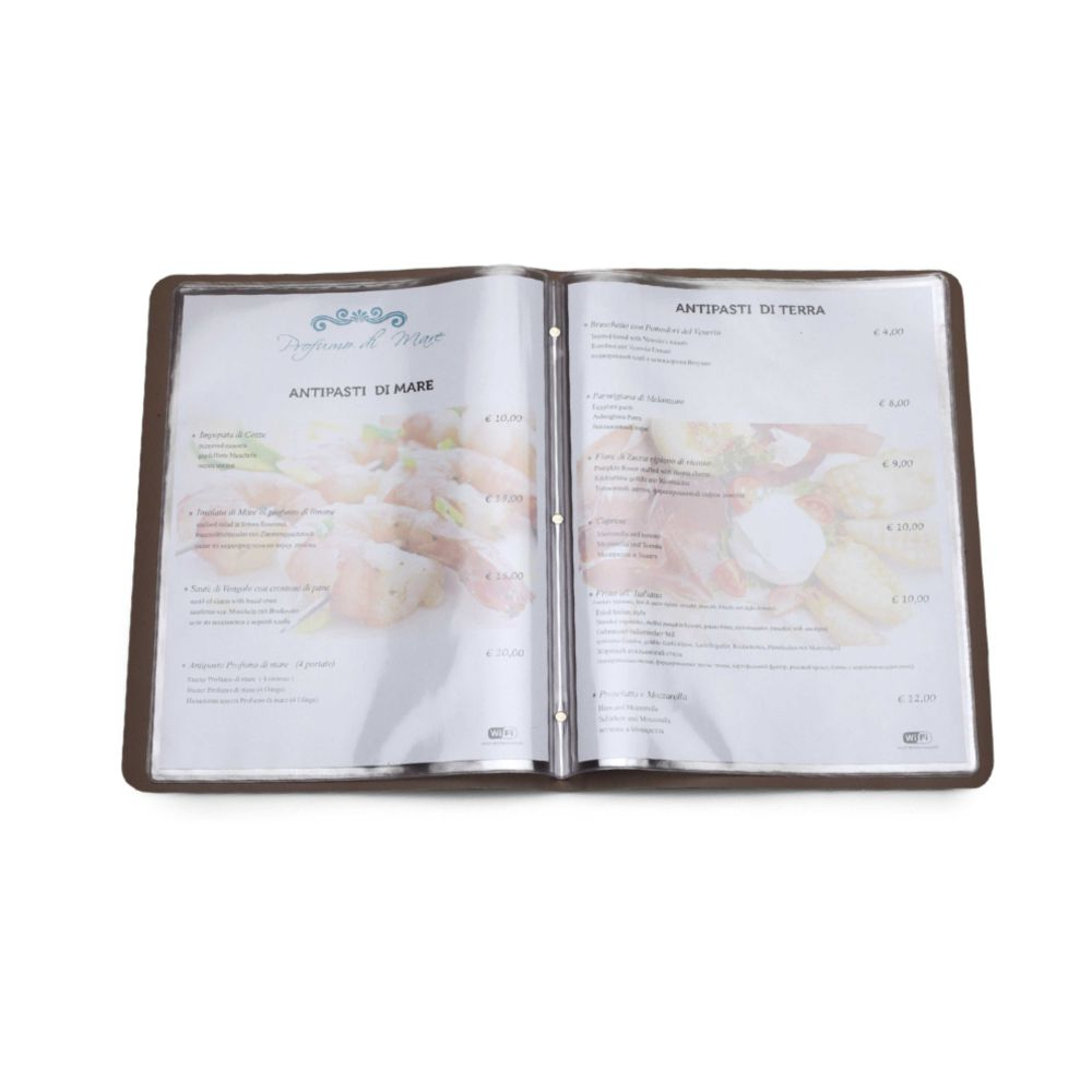 Porta menù flexi in PU termovirante. Adatto per stampa a caldo. 8 buste bifacciali. Colori: tor-tora, marrone. Dimensioni cm.23x33 Imballo: 20xcolore