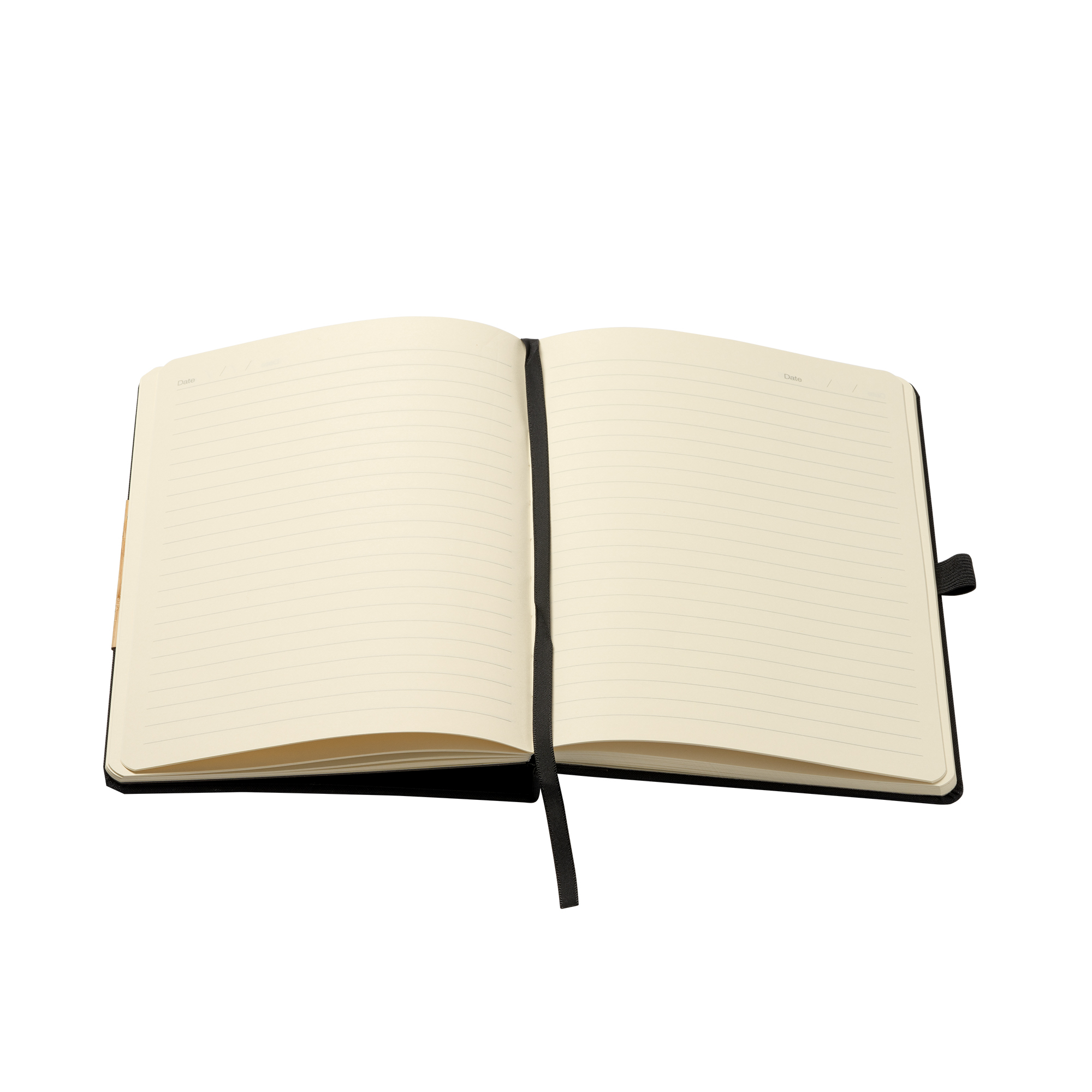 Block notes con copertina rigida in RPET, funzione di supporto cellulare, chiusura con elastico, inserto per penna, 80 fogli. Confezione in polybag. Dimensioni: cm 15x21x1,5. Imballo: 40pz.