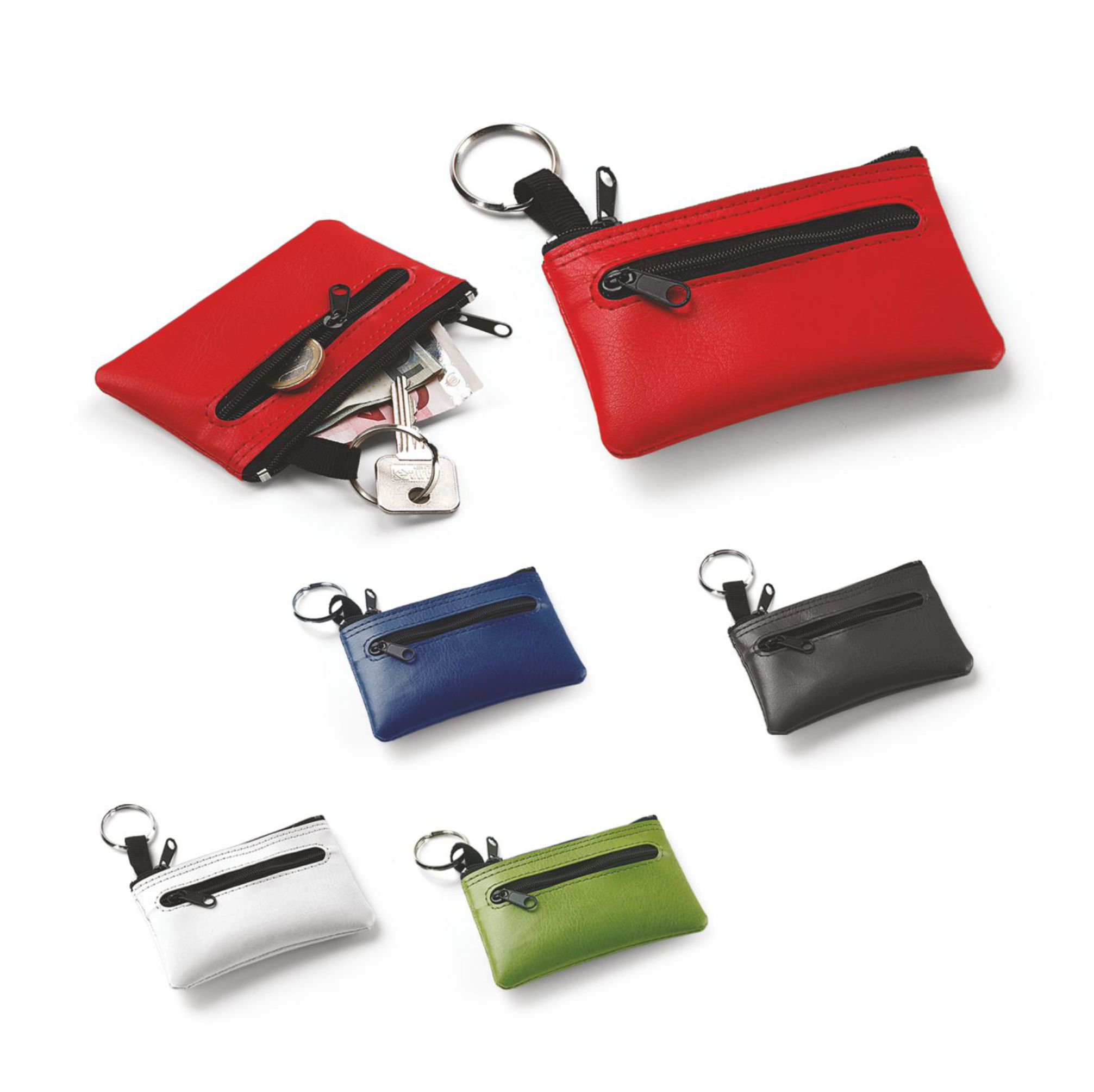 Portachiavi-portamonete in pu termovirante. Chiusura con doppia zip. Colori: rosso, nero, gial-lo, bianco, verde, blu. Confezione in polybag. Dimensioni cm.11x7,5