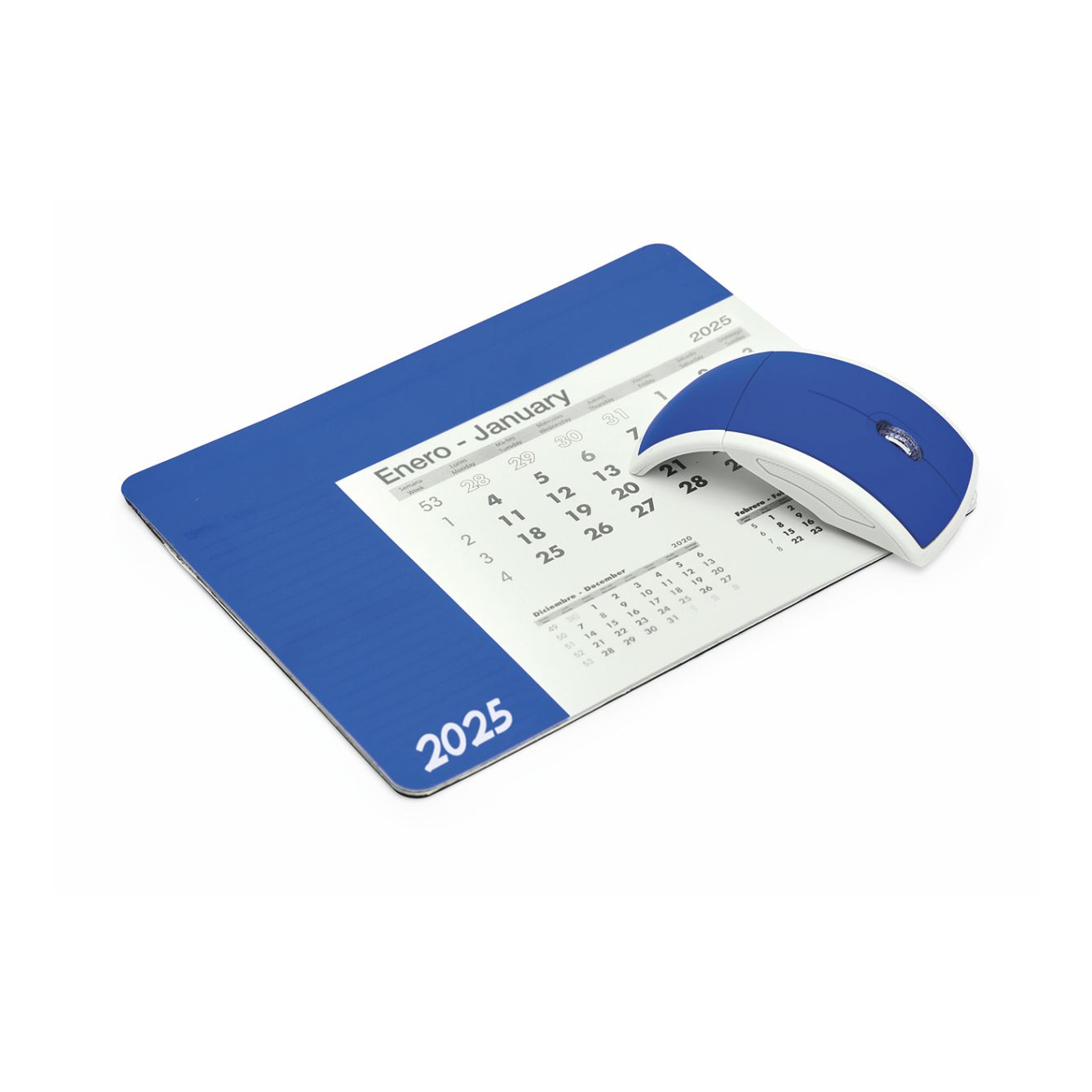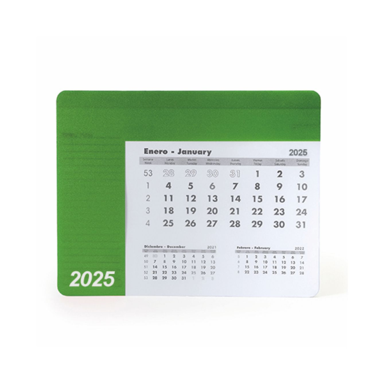 Tappetino rettangolare per mouse con calendario. Copertina in un unico colore e trasparente, per poter vedere il foglio del mese corrispondente. La copertina è sollevata per accedere al calendario di 12 pagine in spagnolo e inglese, le cui pagine sono ma strappo. Su ogni foglio appaiono il mese in corso, il mese precedente e il mese successivo. Base antiscivolo nera. Grammatura carta 80 g/m². Spessore della copertina 0,3cm. Dimensioni: 23cm x 18cm