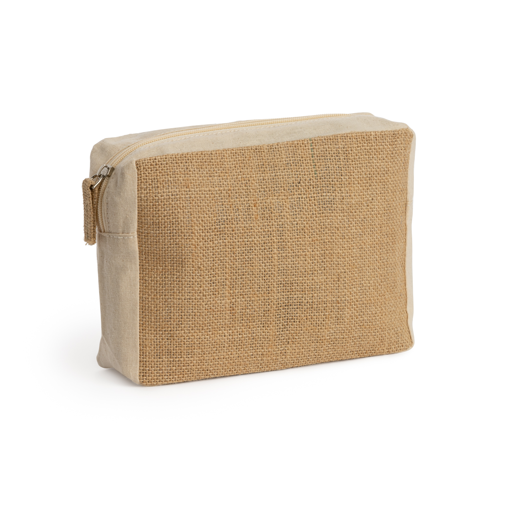 Beauty case in cotone e juta laminata. Zip con tiretto in juta abbinato. Dimensioni: cm 20x15x6. Imballo: 200pz.