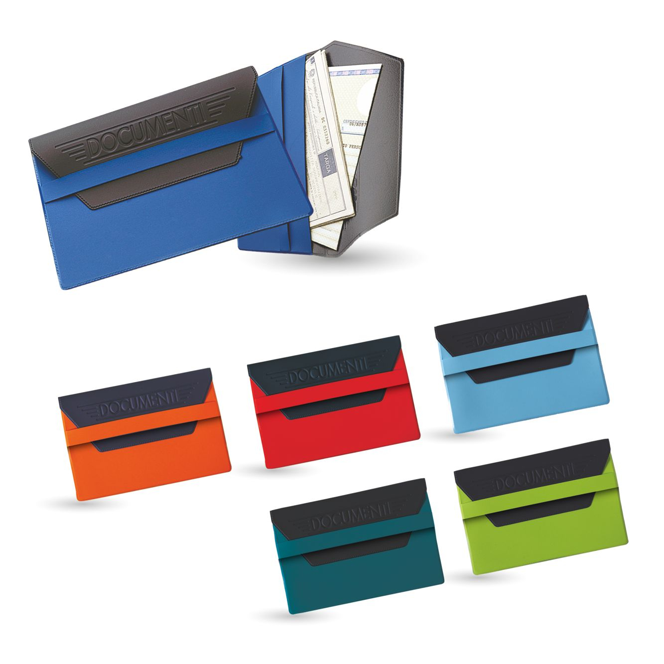 Porta documenti con fascetta in tam bicolore. Colori: verde, rosso, royal, arancio, sky, verde li-me. Dimensioni cm 19x13