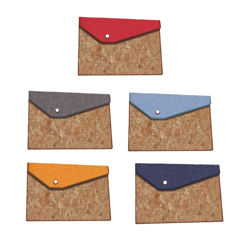 Porta documenti cucito. In sughero e pu termovirante. Interno foderato. Colori: blu, grigio, sky, rosso, giallo. Dimensioni cm. 19x13 Imballo: 100xcolore