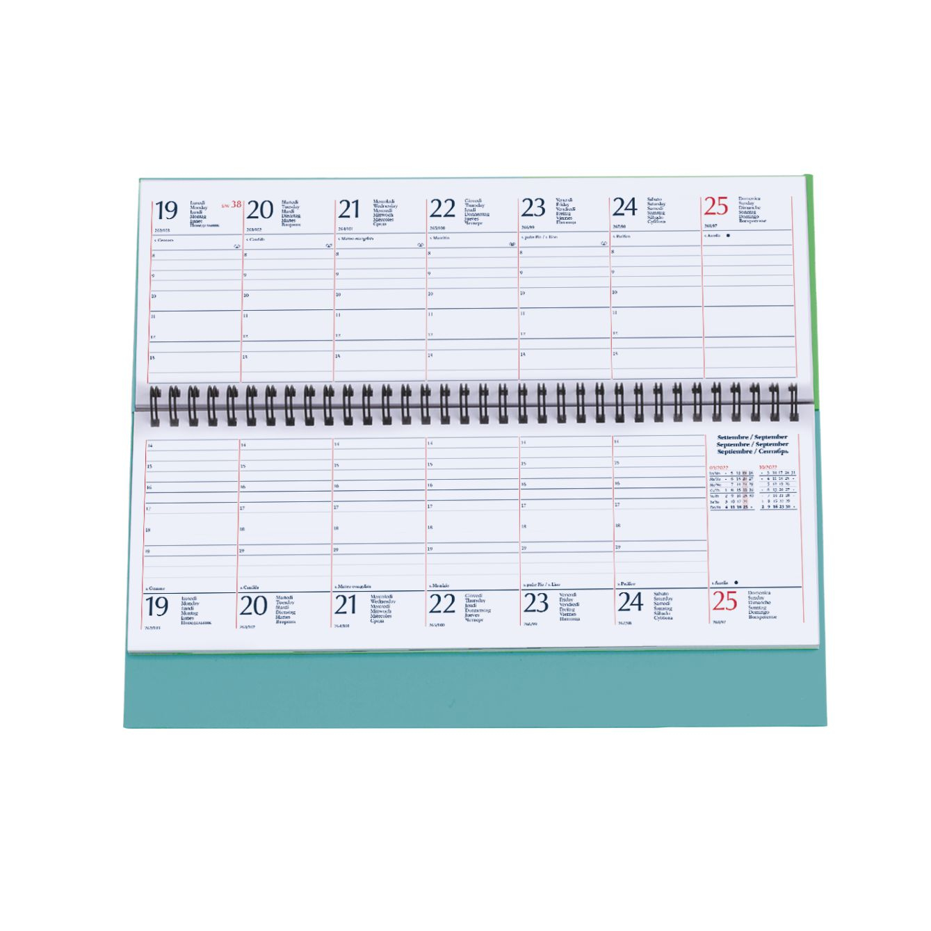 Planning spiralato in matra. 128 pagine. Carta usomano bianca 70 gr. Interno stampa 2 colori, datato. Colori: verde, cielo, verde acqua, royal, arancio, bianco. Dimensioni cm 30x15 Imballo: 20xcolore