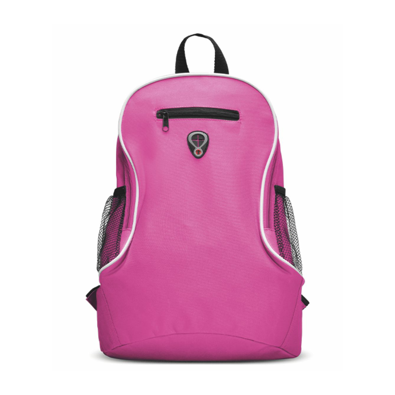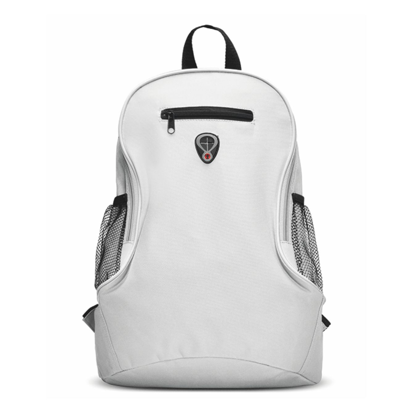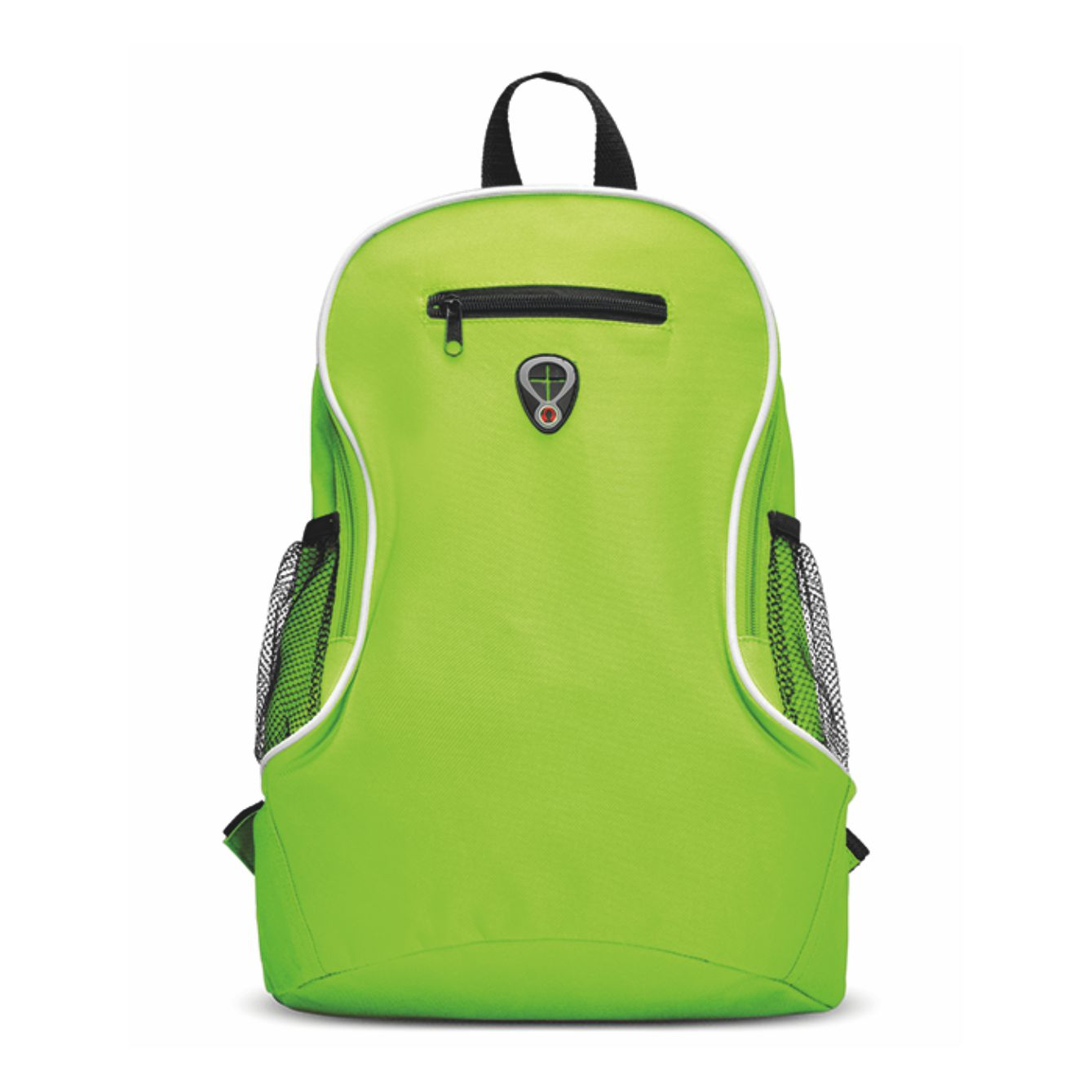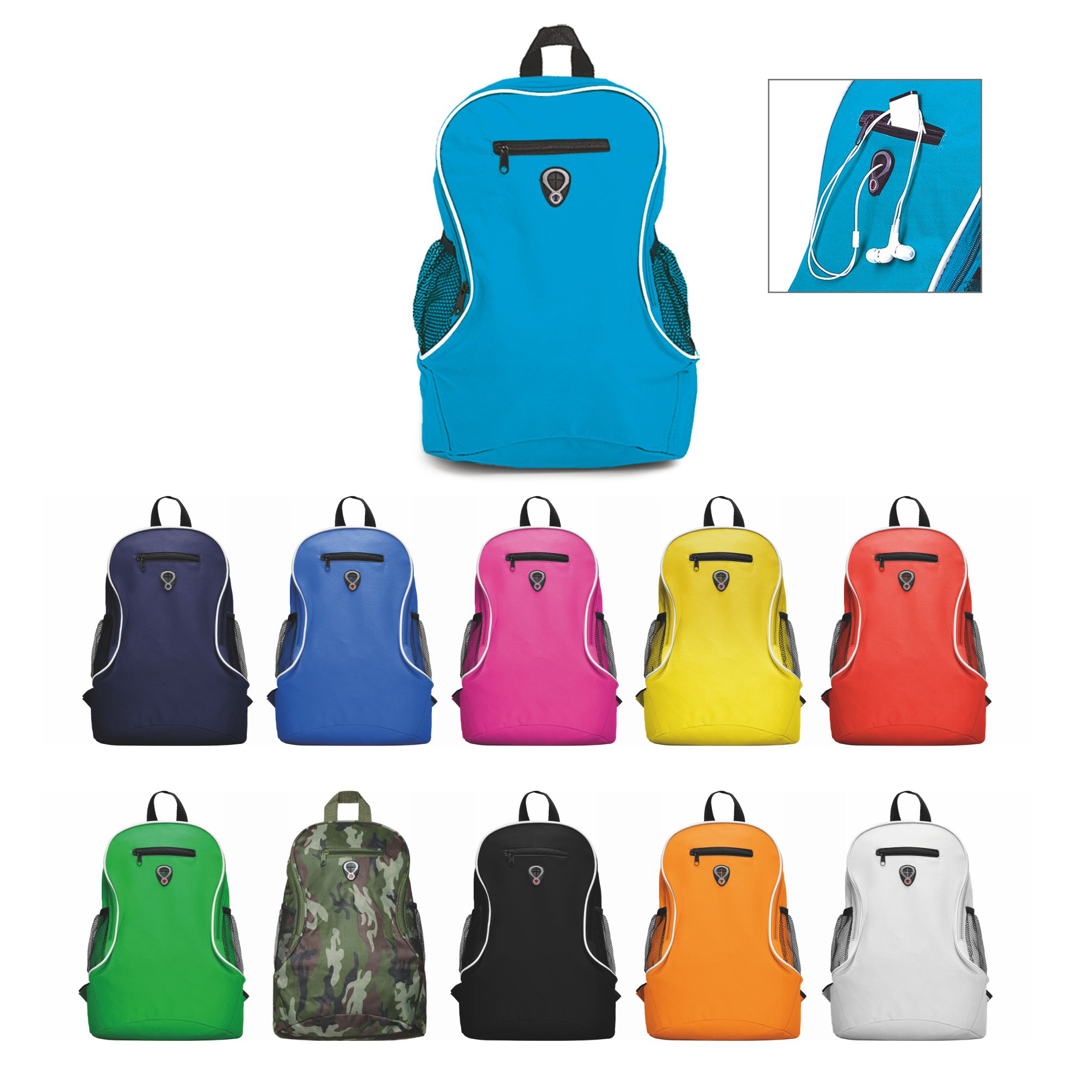 Zaino in poliestere 600D. Chiusura con zip. Tasca frontale con uscita auricolari chiusa da zip. Corredato di manico rinforzato. Tracolle salva spalle regolabili. Taschini laterali a rete. Confezione in polybag. Dimensioni cm. 29x40x17. Imballo: 40xcolore