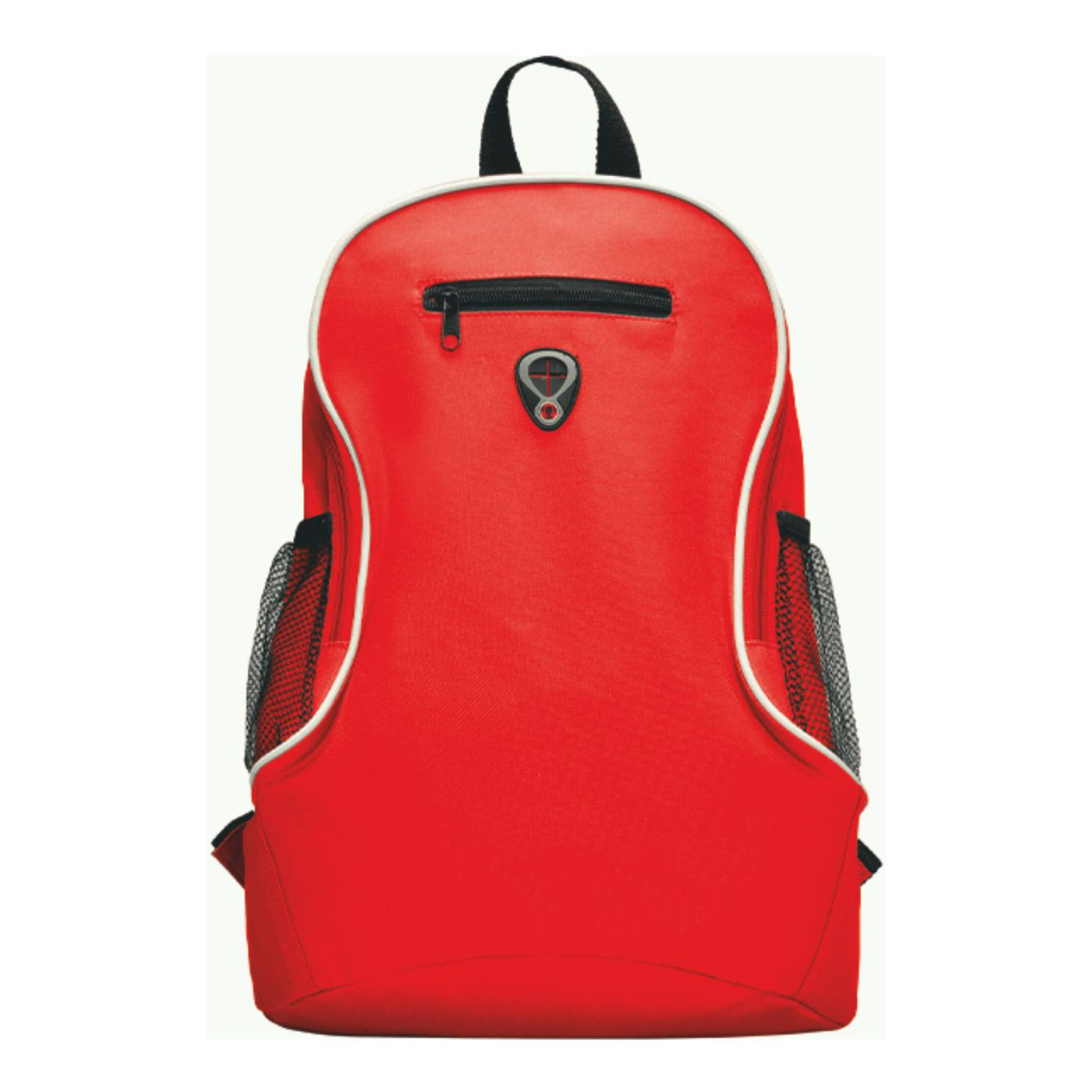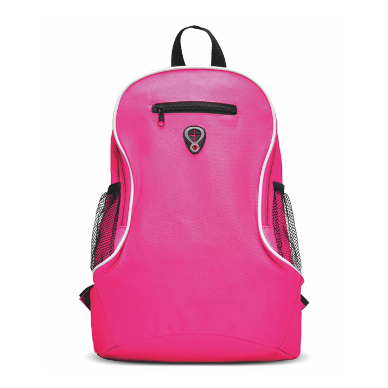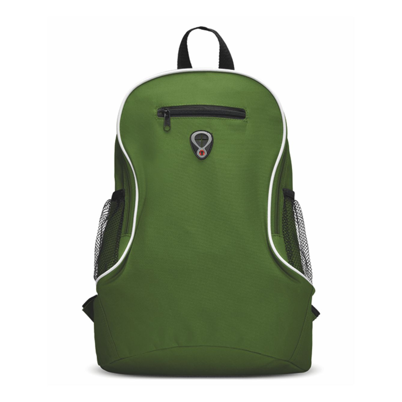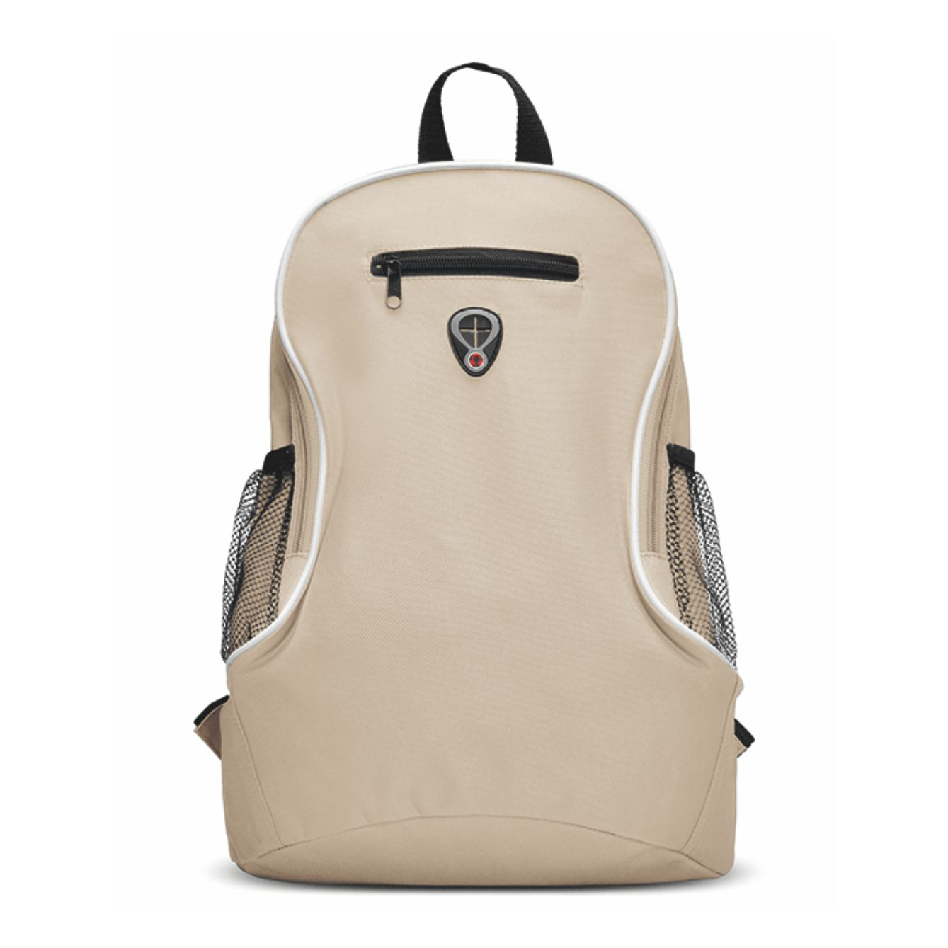 Zaino in poliestere 600D. Chiusura con zip. Tasca frontale con uscita auricolari chiusa da zip. Corredato di manico rinforzato. Tracolle salva spalle regolabili. Taschini laterali a rete. Confezione in polybag. Dimensioni cm. 29x40x17. Imballo: 40xcolore