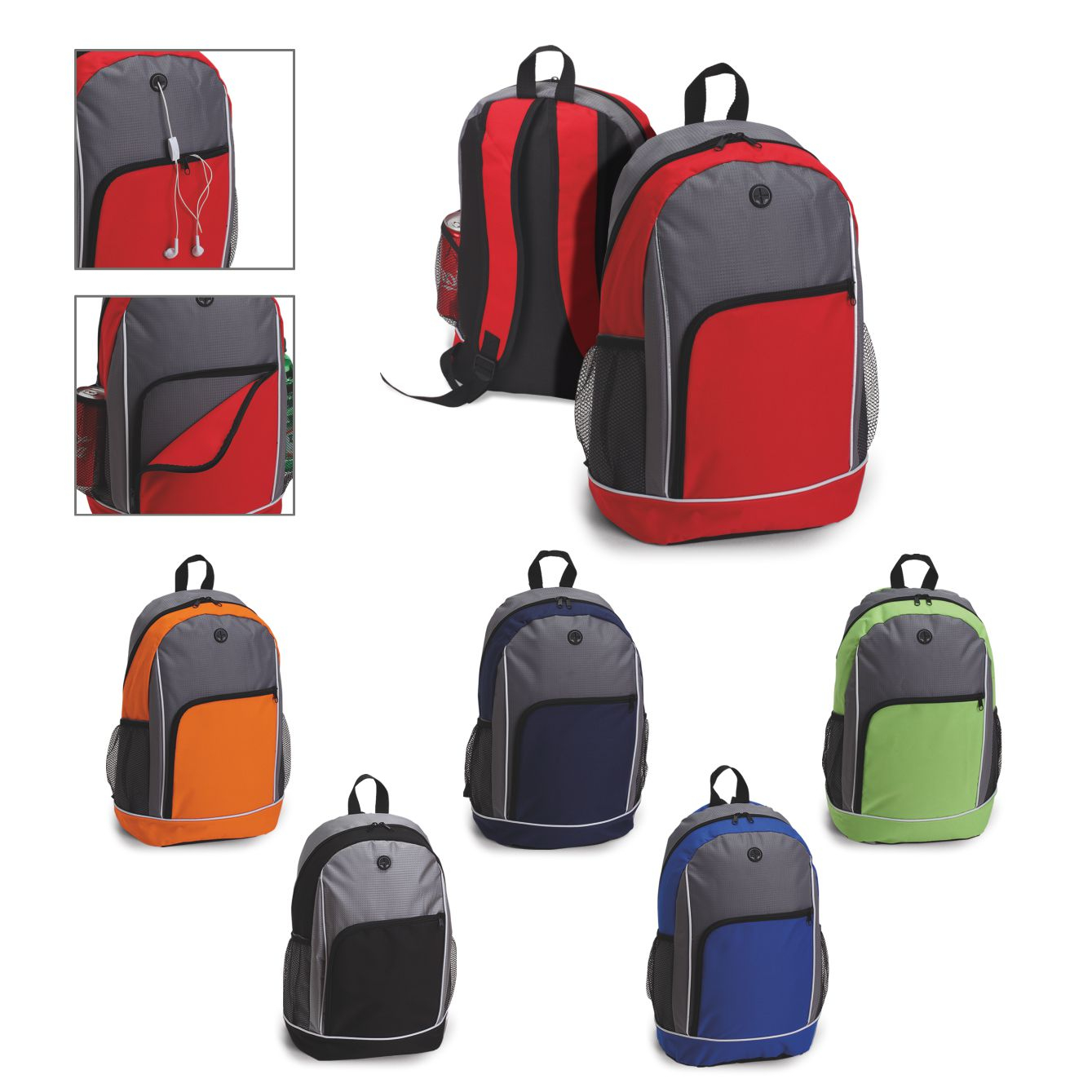 Zaino in poliestere 600D e jaquard. Chiusura doppio cursore, uscita auricolari. Spallacci imbottiti e regolabili. Taschini laterali elasticizzati in rete mesh. Tasca anteriore chiusa da zip. Colori: ros-so, arancio, blu, royal, nero, verde. Confezione in polybag. Dimensioni cm. 30x17,5x44,5 Imballo: 40xcolore