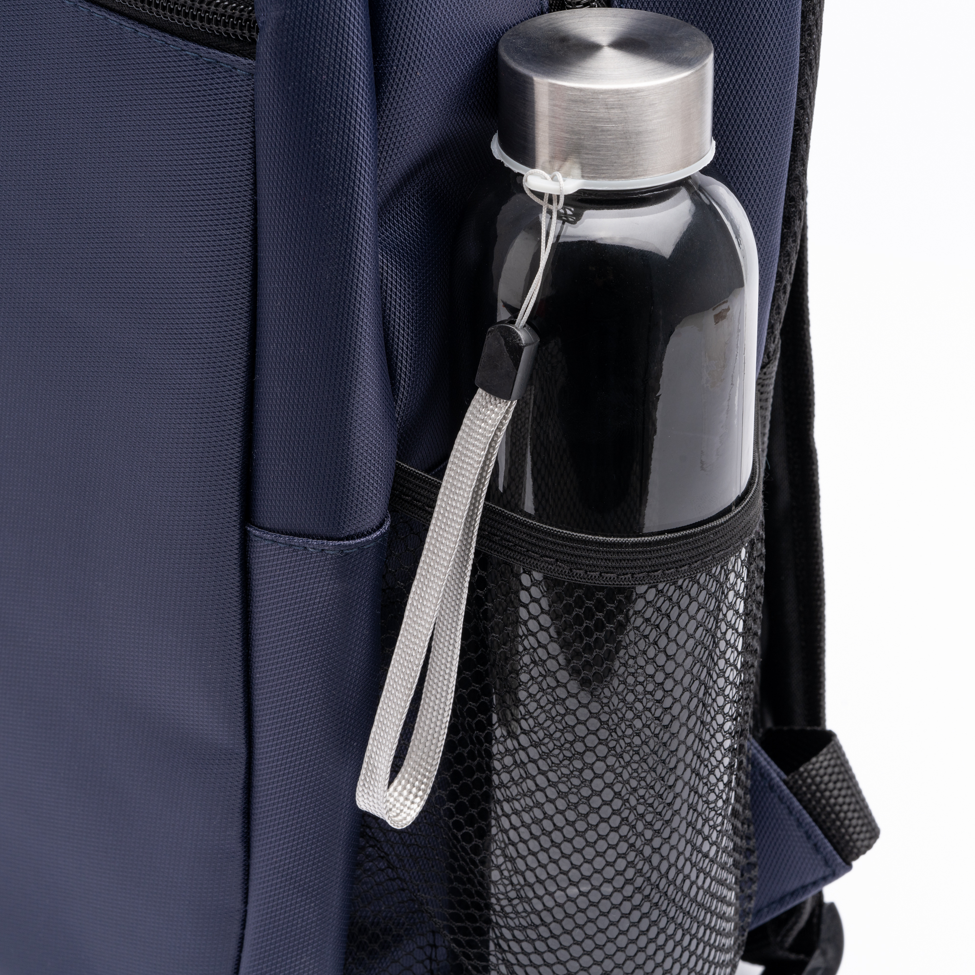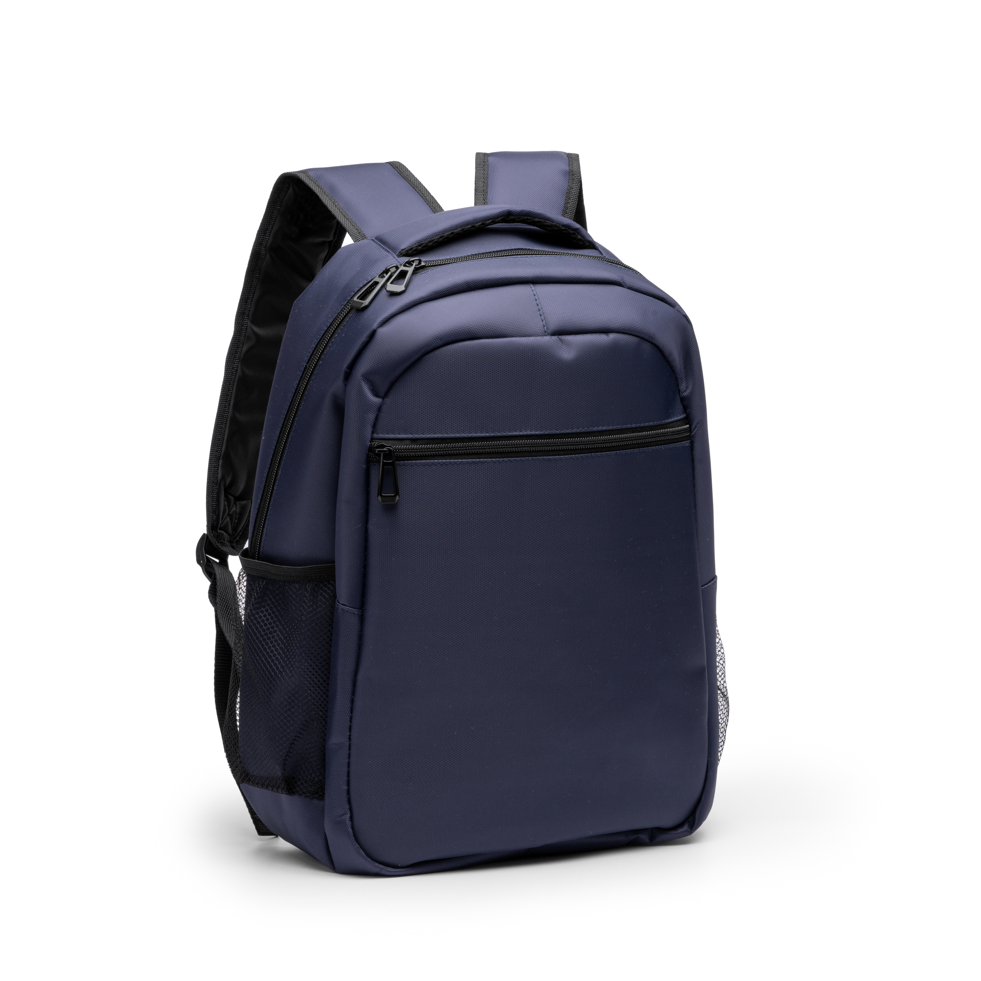 Zaino executive in nylon riciclato. Ampio scomparto principale e tasca imbottita per un computer portatile da 15. Una tasca esterna e 2 tasche laterali. Spallacci e schienale imbottiti. Cinghia per trolley. Dimensioni: cm 32x42x15