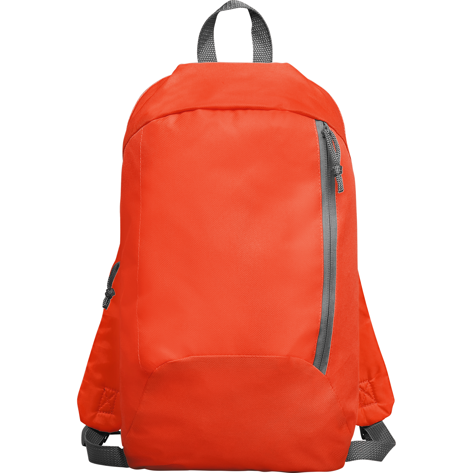 Piccolo zaino in poliestere con maniglie regolabili. 1.- Maniglia superiore per appendere. 2.- Tasca frontale con zip verticale. Molto leggero e compatto. Dimensioni: cm 23x40