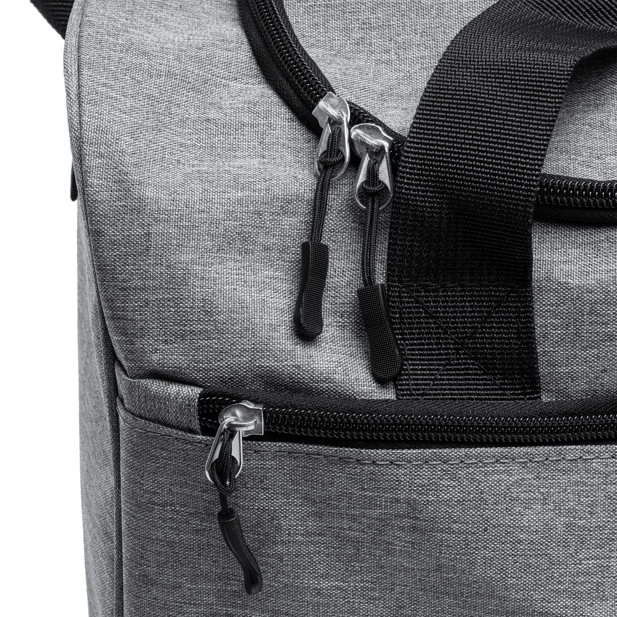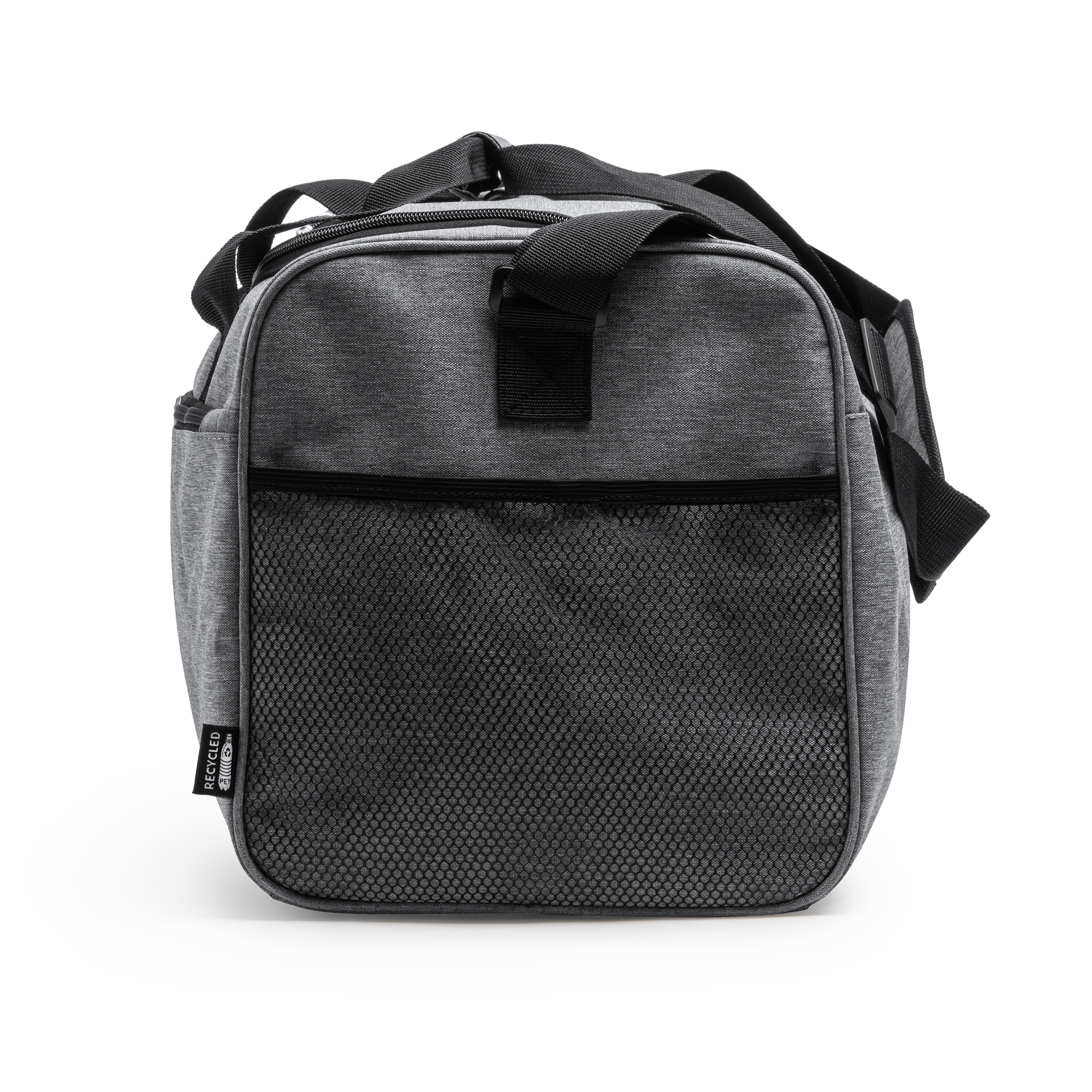 Borsa multifunzionale in RPET 300D con finitura mélange. Capacità 30 litri. Chiusura a cerniera nella tasca principale e in quella anteriore. Tasca laterale a rete. Tracolla regolabile inclusa. Dimensioni: cm 50x28x24