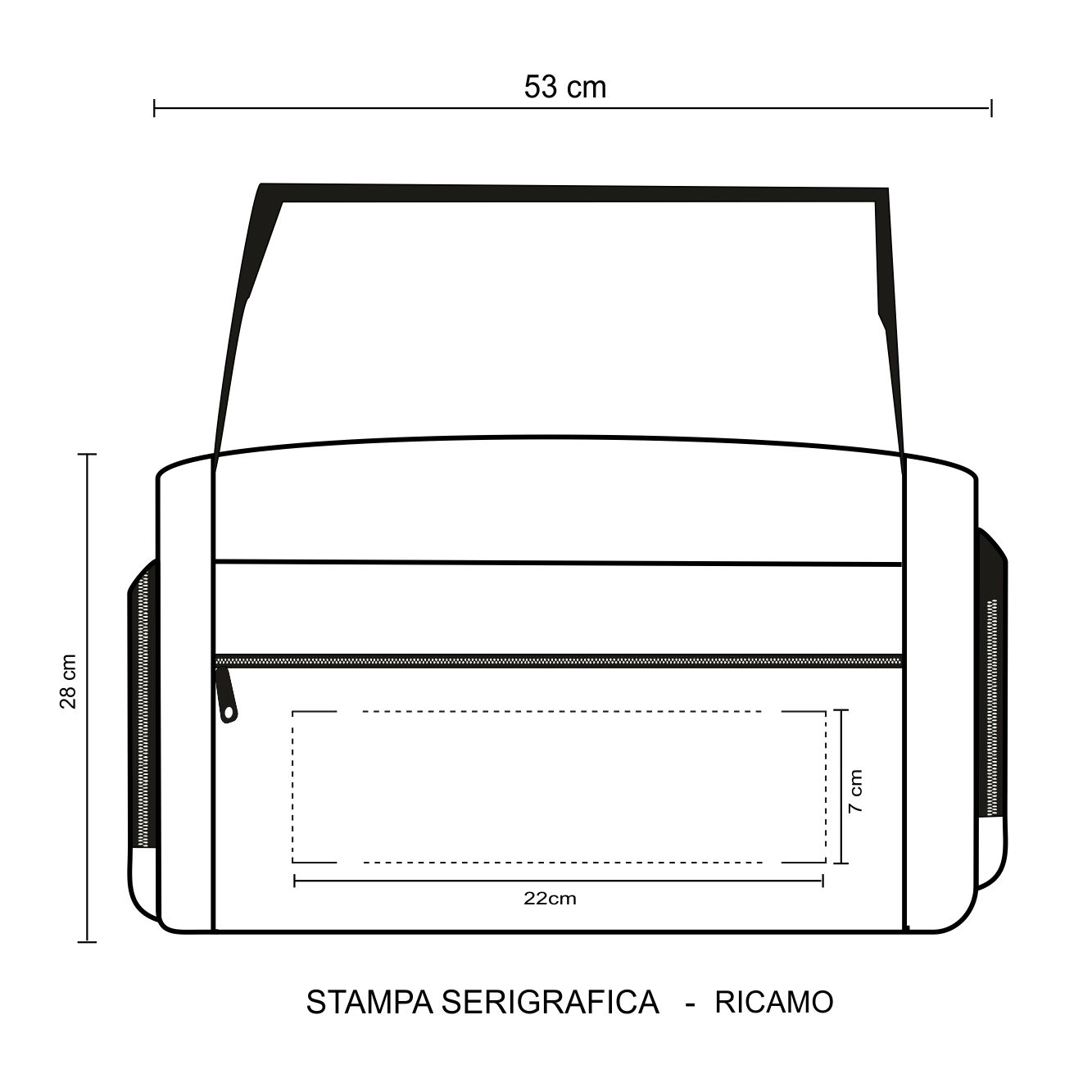 Borsa palestra in poliestere 600D. Tascone anteriore con zip. Doppie tasche laterali chiuse da zip: uso termico, uso porta scarpe. Manico a tracolla salva spalle. Interno plastificato. Colori: royal, rosso, nero, blu, grigio, fuxia, verde lime, arancio. Confezione in polybag. . Dimensioni cm.53x28x30 Imballo: 20xcolore