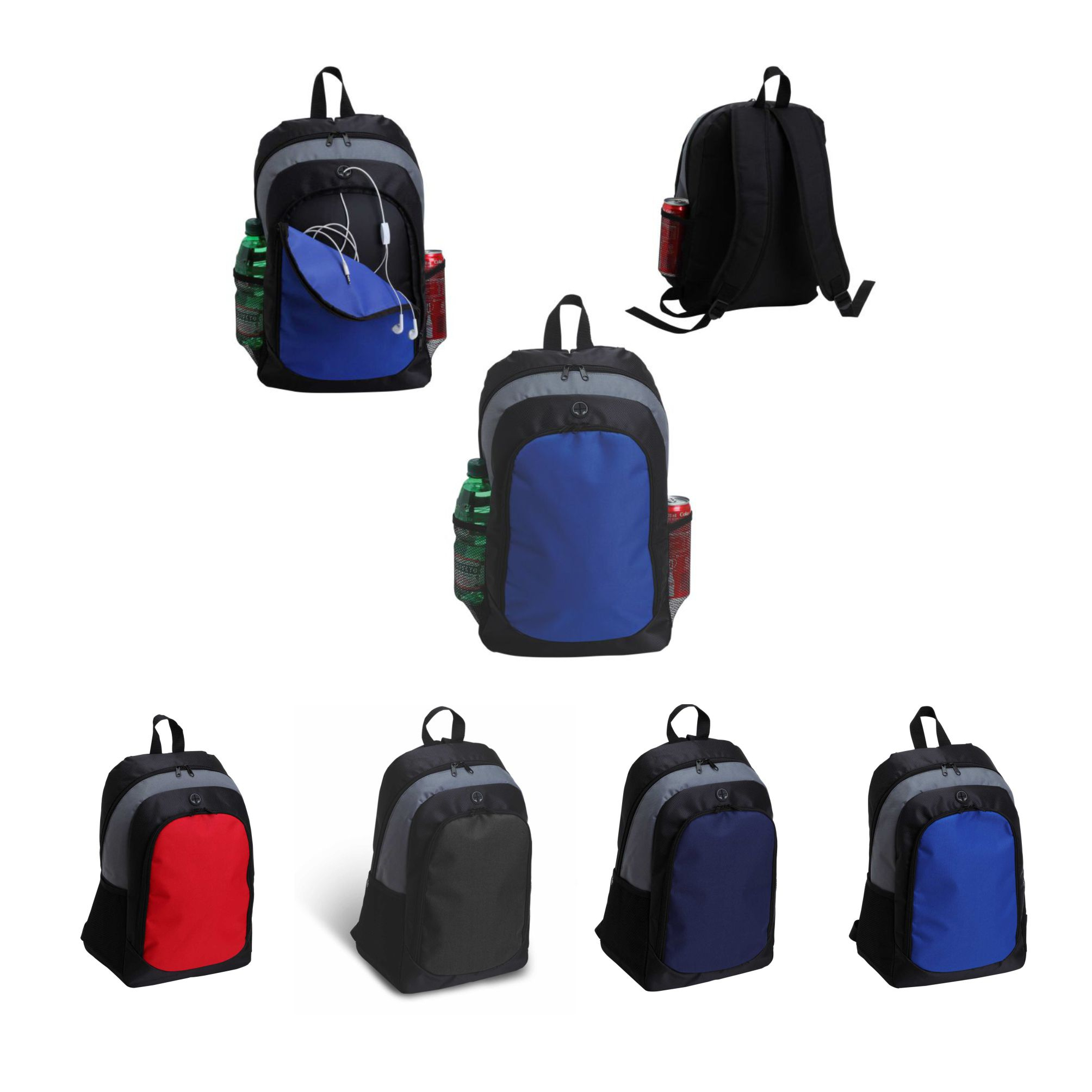 Zaino in poliestere 600D e jacquard. Chiusura con zip doppio cursore. Uscita auricolari. Tasca frontale doppio cursore. Corredato di manico rinforzato. Schienale e spallacci imbottiti e regolabili. Taschini laterali in rete mash. Colori: rosso, nero, blu, verde, royal, Confezione in polybag. Dimensioni cm. 30,5x15,5x43,5 Imballo: 40xcolore