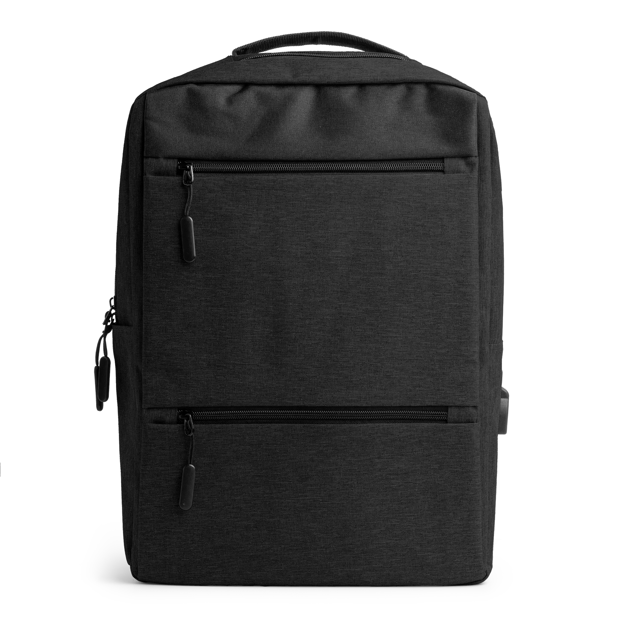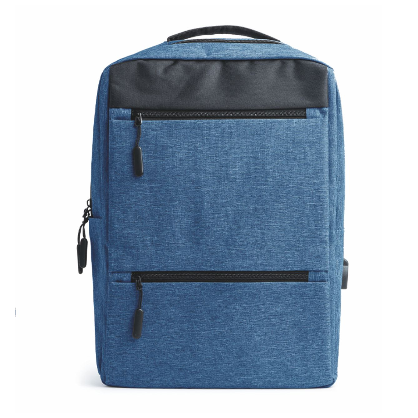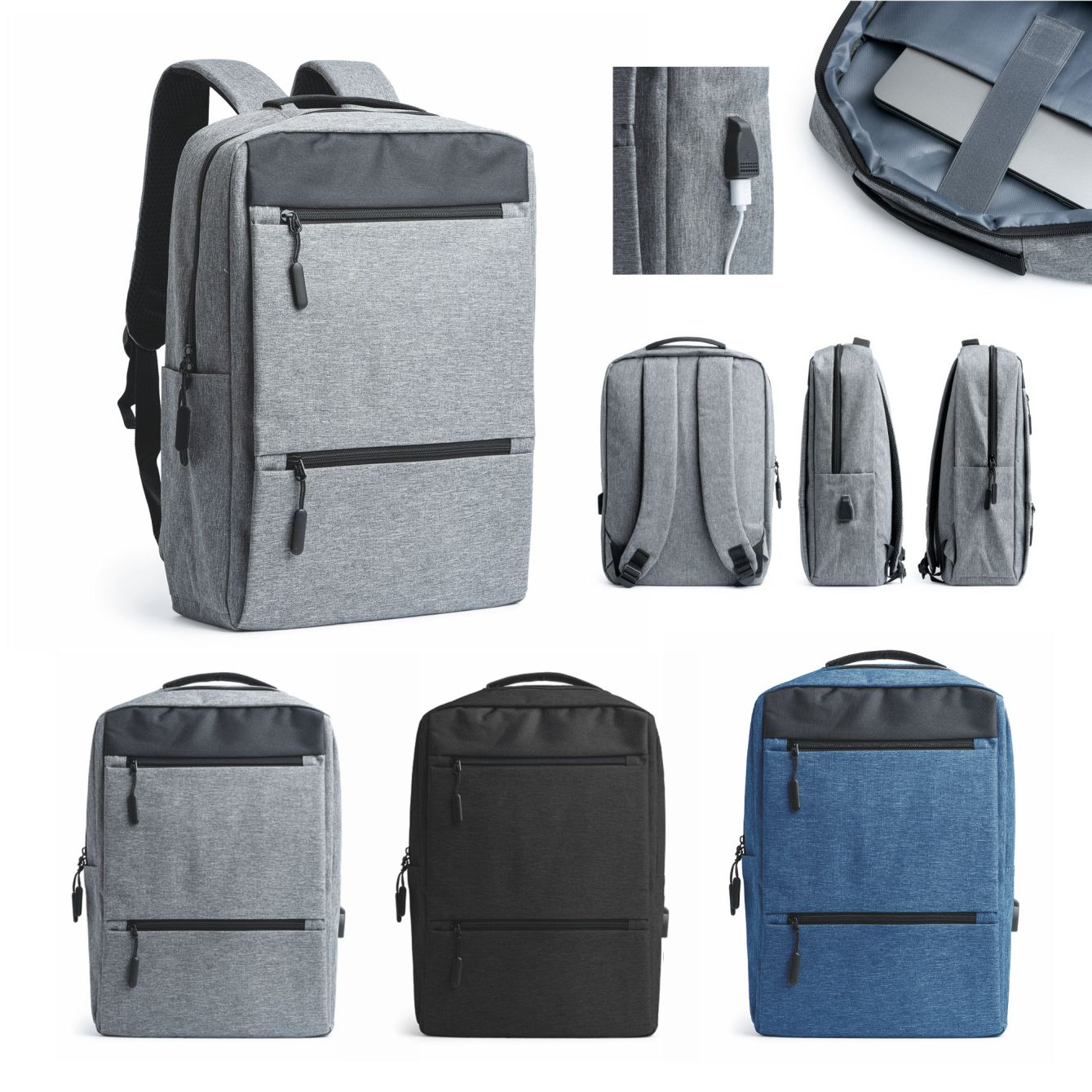 Zaino in poliestere 300D con finitura OXFORD. Tasca principale imbottita per il computer, porta USB per alimentatore portatile (non incluso), tasche frontali e laterali, spalline e schienale imbottiti. Dimensioni: cm 31x43x16. Imballo: 20pz.