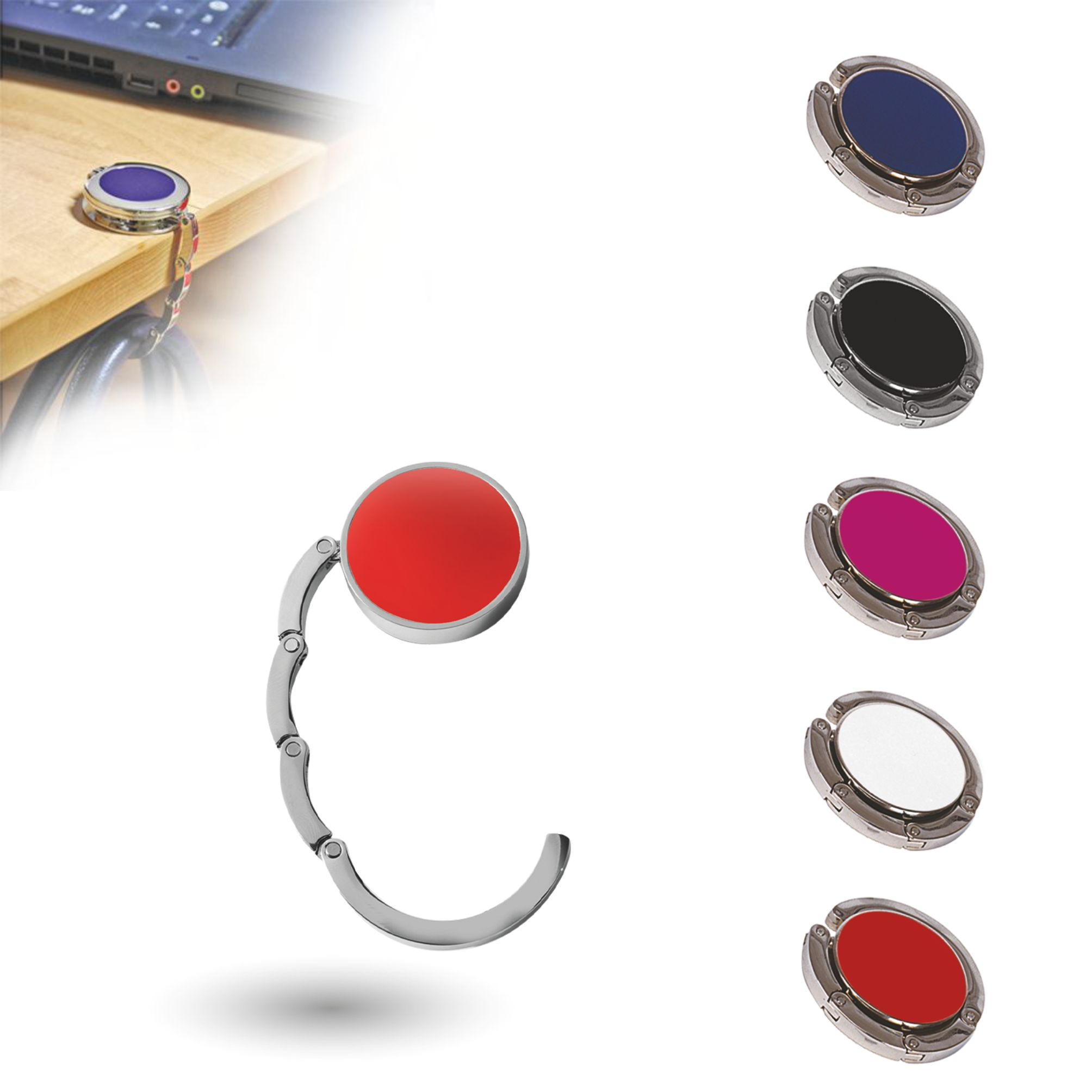 Gancio reggiborsa in metallo e plastica. Colori: bianco, nero, rosso, blu. Confezione astuccio. Dimensioni Ǿ cm 4,5 Imballo: 200xcolore