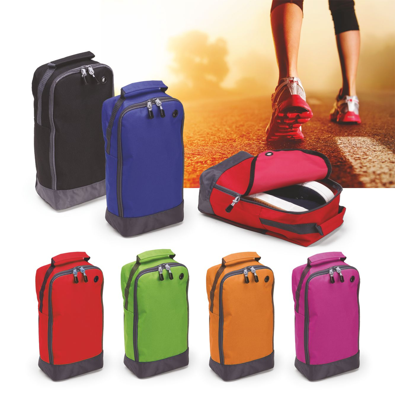 Porta scarpe in poliestere 600D. Chiusura con zip doppio cursore. Tasca posteriore a rete. Cor-redato di asola traspirante. Colori: rosso, nero, royal, verde lime, arancio, fuxia. Confezione in polybag. Dimensioni cm.21x34x10 Imballo: 100xcolore