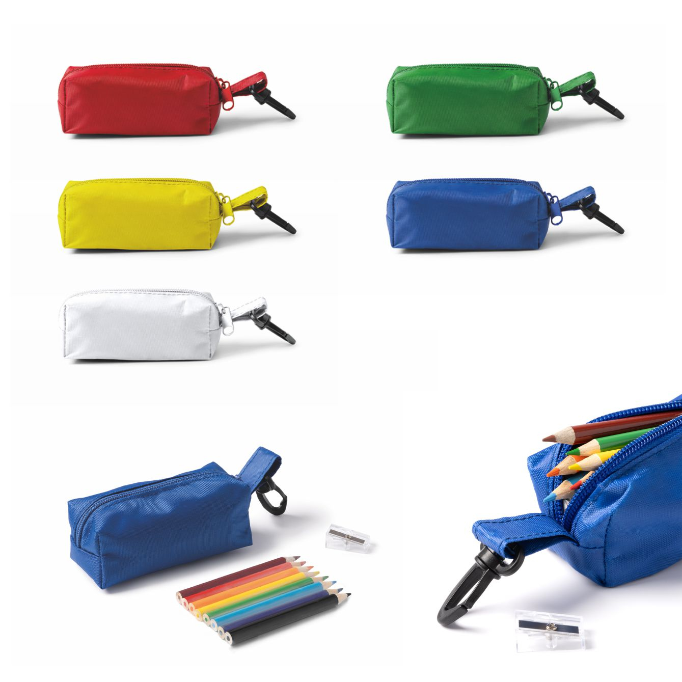 Astuccio per matite in materiale RPET con cerniera coordinata e moschettone girevole. L'astuccio include 8 matite colorate e un temperino. Dimensioni: cm 10x4,5x4