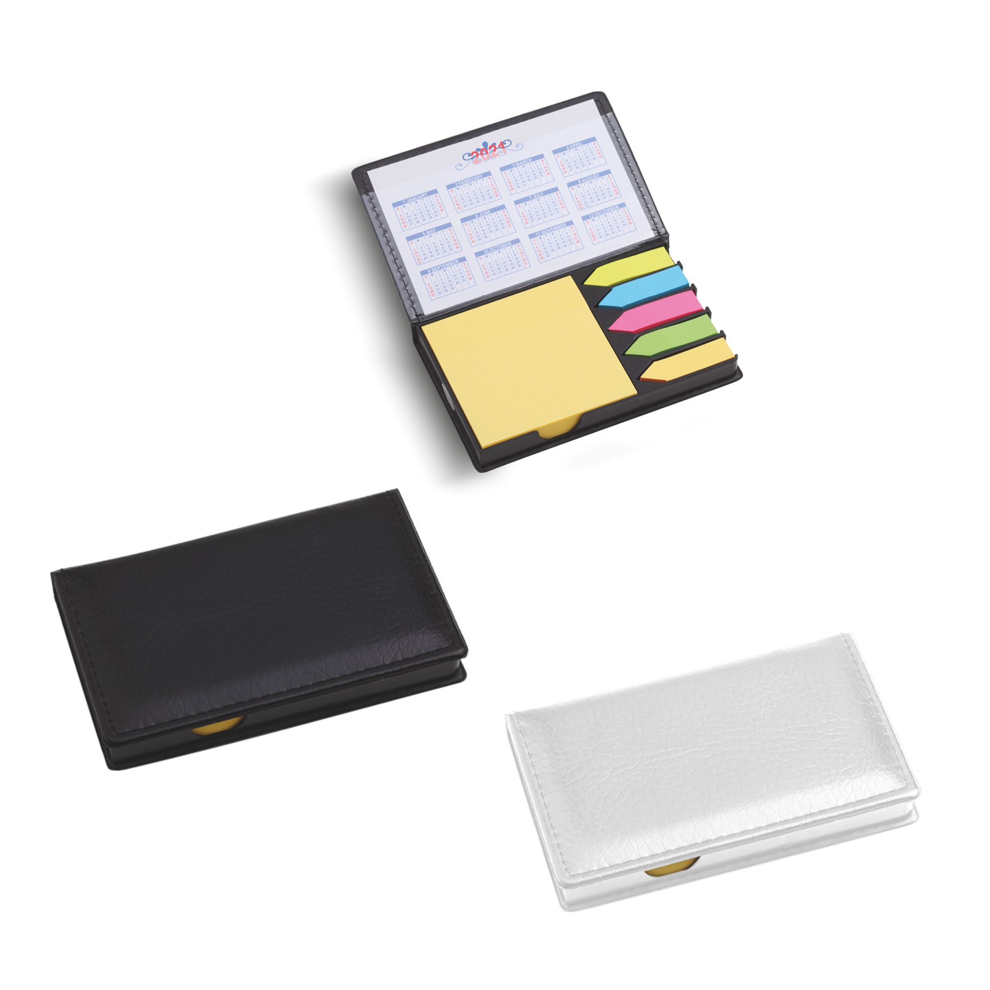 Porta post-it in similpelle. Completo di calendario biennale e 100 post-it multicolore. Confezione in astuccio. Dimensioni: cm.13x8,2x1,5 Imballo: 100
