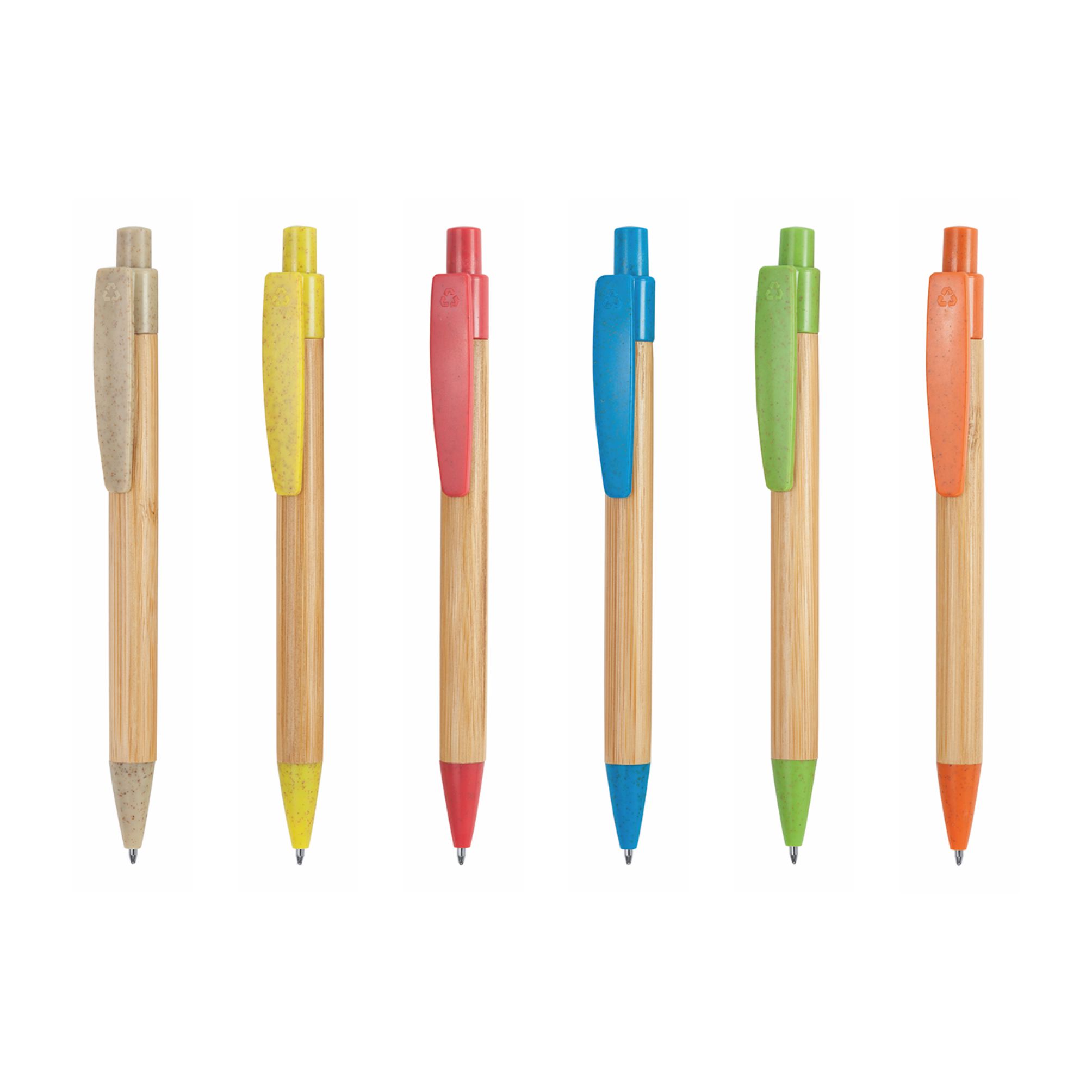 Penna a Sfera. In Bamboo con clip in paglia di frumento. Refill nero. Dimensioni: cm 14. Imballo: 1000pz.
