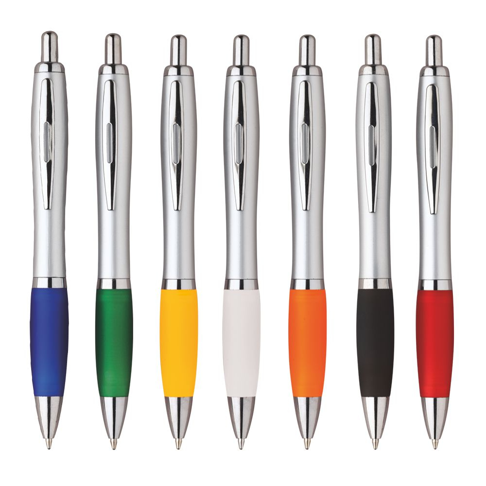 Penna sfera a scatto in plastica con clip metallo. Fusto silver impugnatura colorata. Refill nero. colori: vedi catalogo/sito. Imballo: 1000xcolore