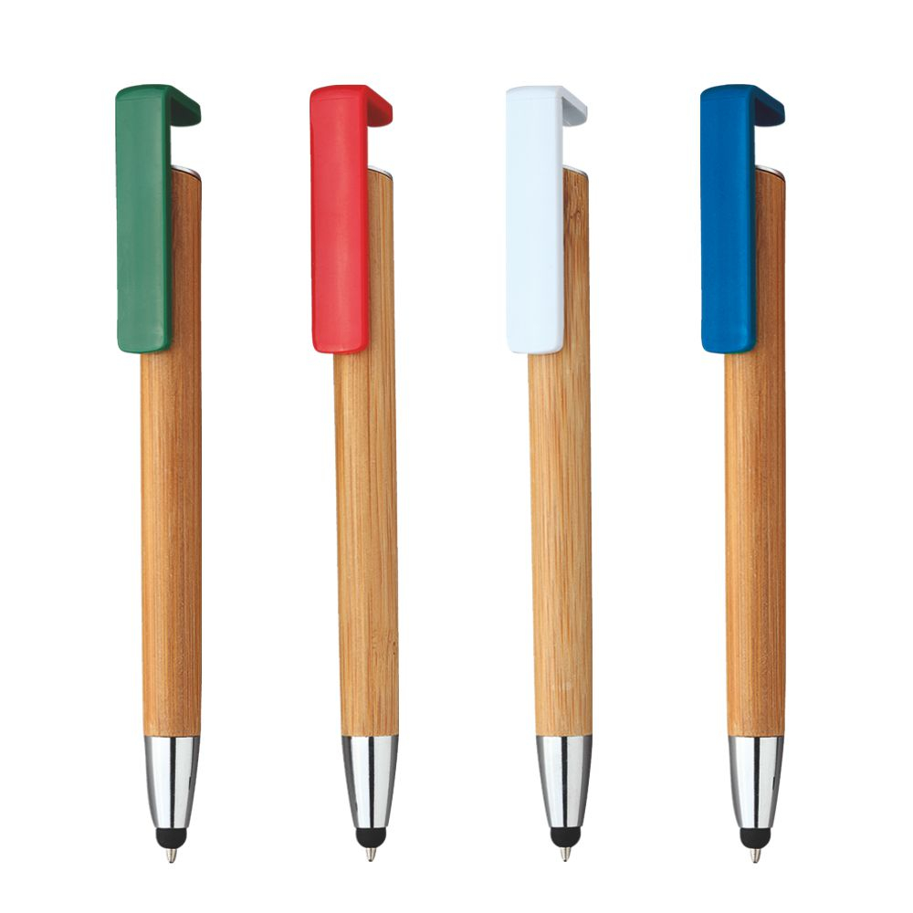Penna sfera touch in bamboo. Clip in plastica funzionalità supporto cellulare. Refill nero. Colori: vedi catalogo/sito. Imballo: 1000xcolore