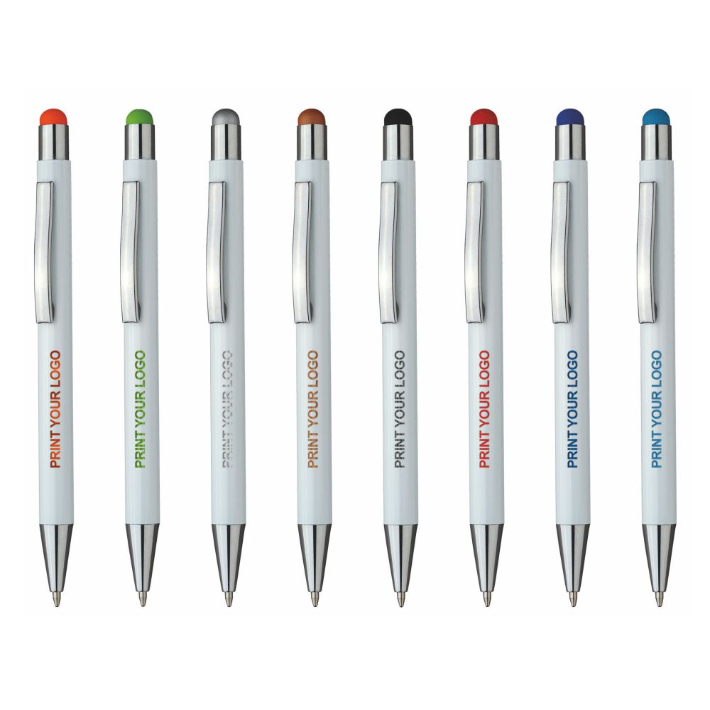 Touch pen a scatto alluminio, clip in metallo. Personalizzabile solo con incisione laser. Il logo inciso avrà il colore degli inserti in gomma. Refill nero. Colori: vedi catalogo/sito. Imballo: 500xcolore