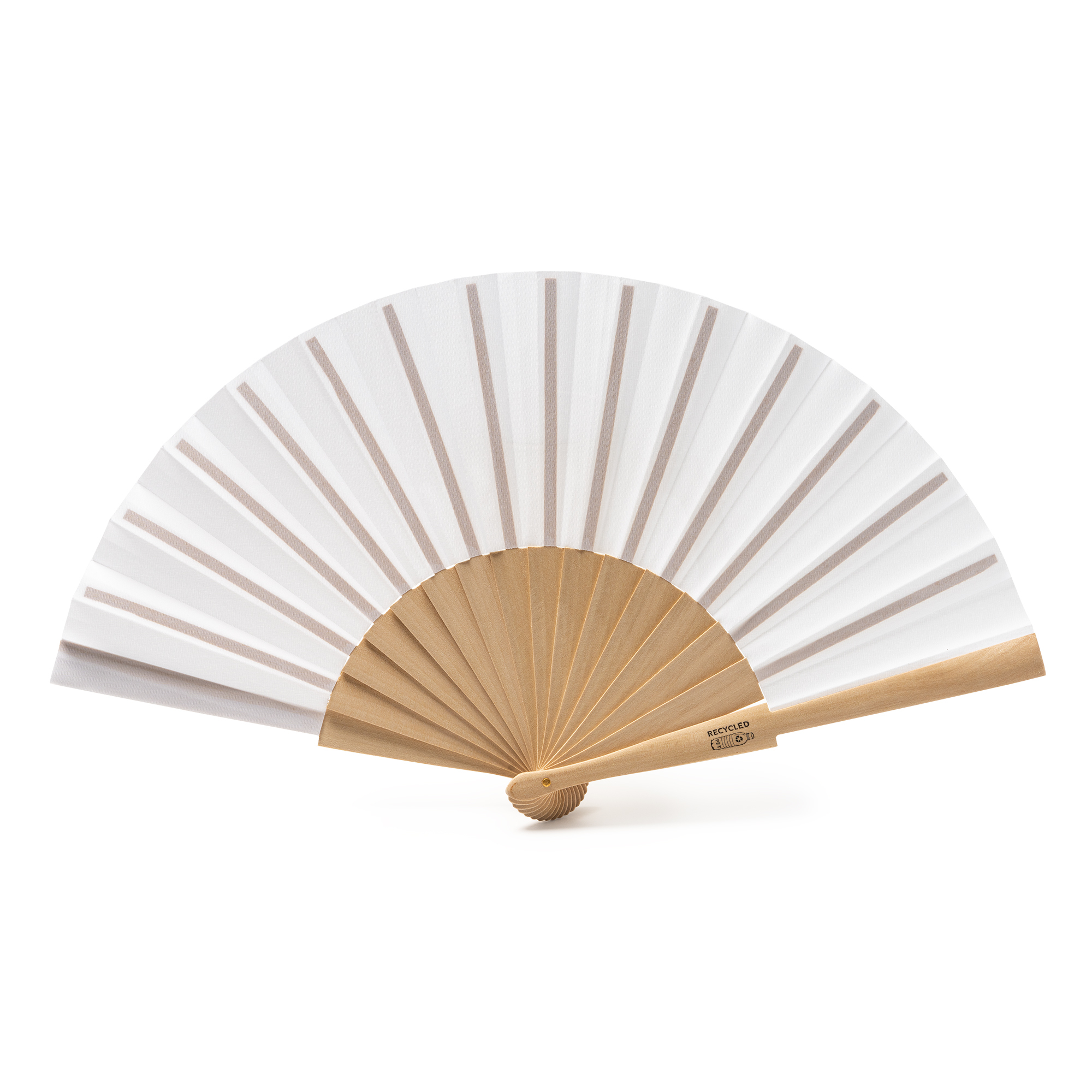 Ventaglio in legno e tessuto RPET. In scatola eco. Dimensioni: cm 42,5x23. Imballo: 250pz.