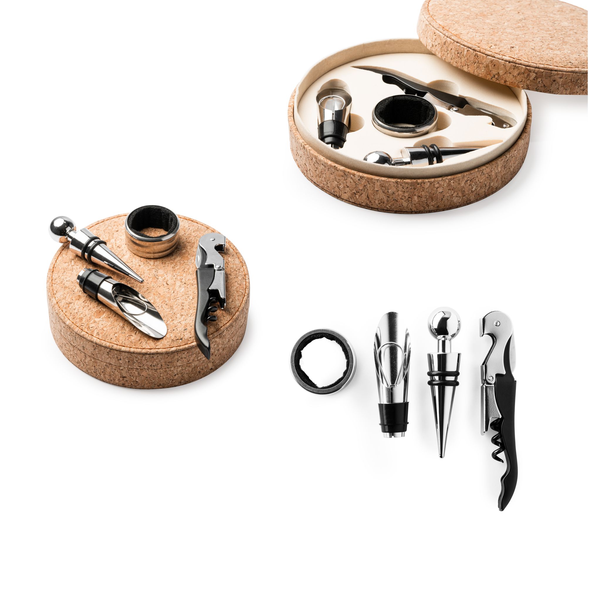 Set vino con accessori in acciaio inox, cavatappi a 2 tempi con tagliacapsule, vaschetta raccogligocce, dosatore e tappo. Presentato in una custodia di sughero. Dimensioni: cm 4,2x14,9. Confezione in astuccio. Imballo: 20pz.