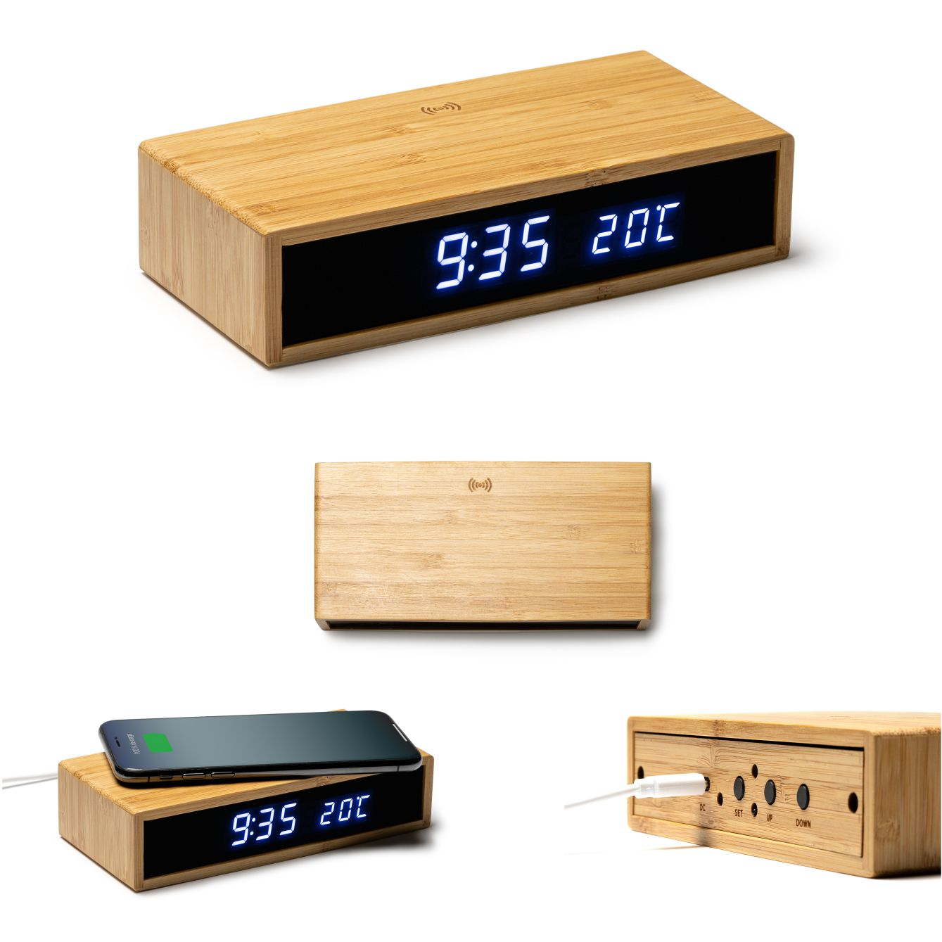 Orologio da tavolo con caricatore wireless da 5W in bamboo. Funzionalità: ora, data, allarme e temperatura. Connessione di tipo C. Cavo incluso. Confezione in scatola dal design ecologico. Dimensioni: cm 16x3,7x7,5