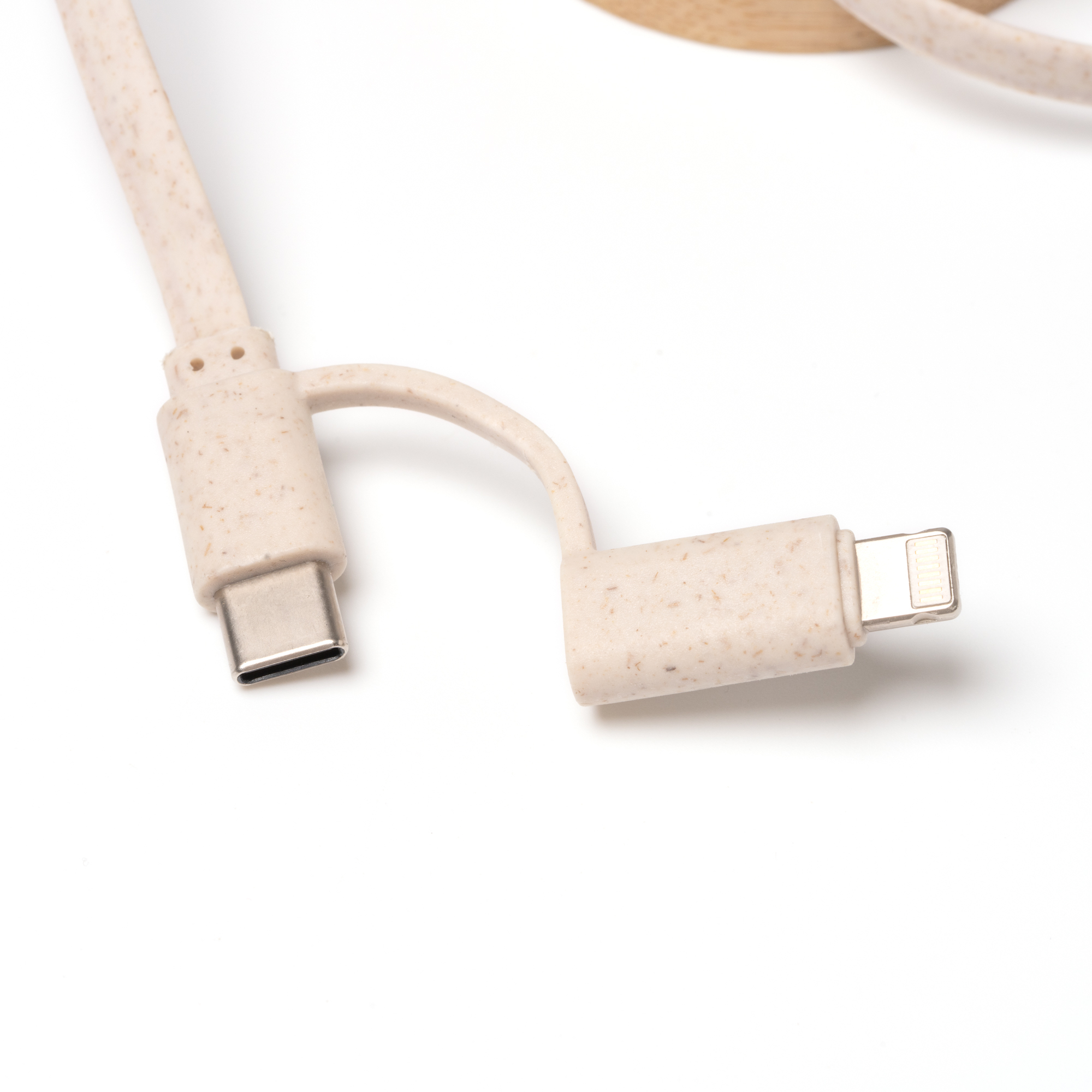 Cavo di ricarica estensibile con struttura principale in bambù e cavo in fibra di grano. Ingressi USB e di tipo C. Uscite lightning e di tipo C. Presentazione in una busta individuale di design ecologico. Dimensioni: cm 22x1,9Ø