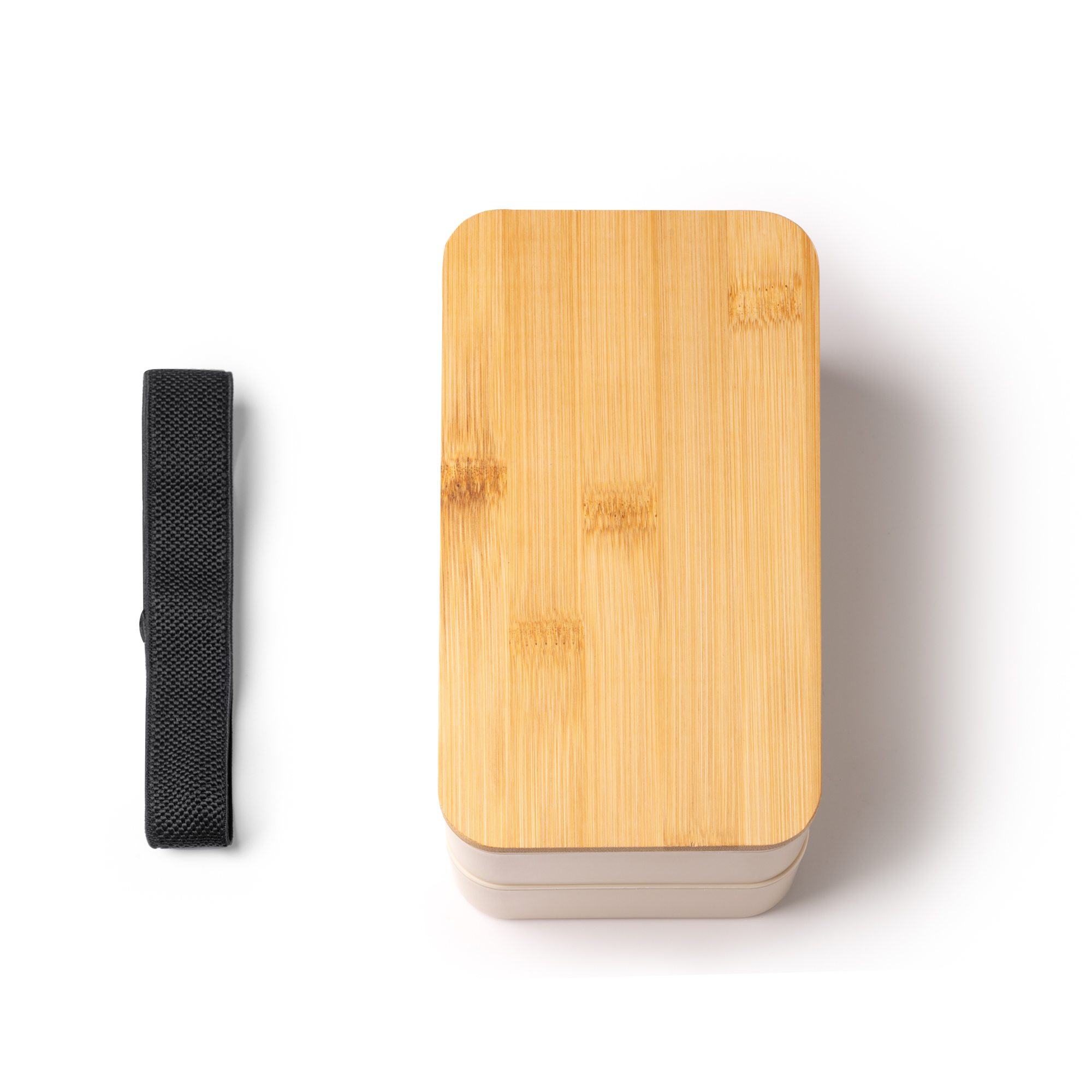 Scatola per il pranzo in PP con due scomparti e coperchio in bamboo. Set di posate, divisorio staccabile e cinghia di serraggio inclusi. Capacità 800 ml. Dimensioni: cm 18x10,6x9,6
