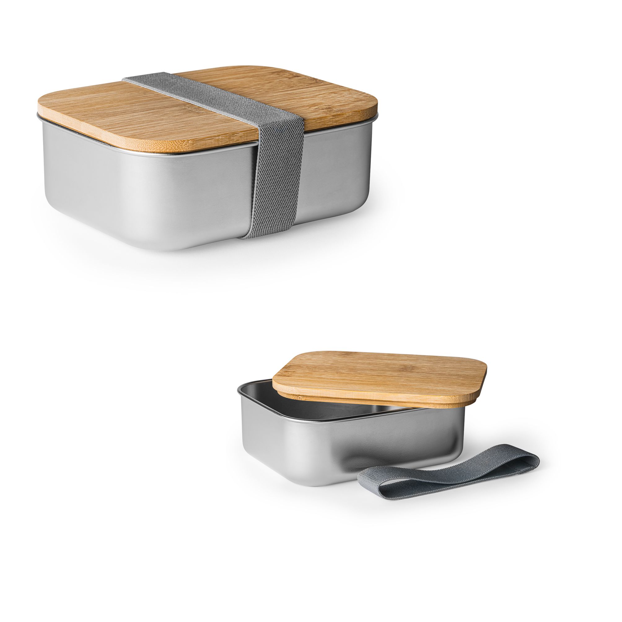 Lunch box in acciao inox 304 con coperchio in bamboo e fascia di sicurezza in poliestere. Capacità 800 ml. Dimensioni: cm 15,8x6,1x11,9. Confezione in astuccio. Imballo: 30pz.
