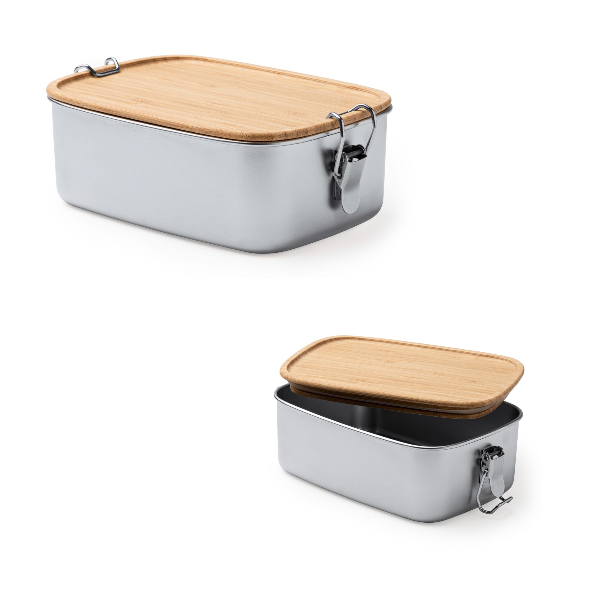 Lunch box in acciao inox 304 con coperchio in bamboo. Sistema di chiusura con fibbia laterale. Capacità 1L. Dimensioni: cm 19,4x6,8x13,1. Confezione in astuccio. Imballo: 30pz.