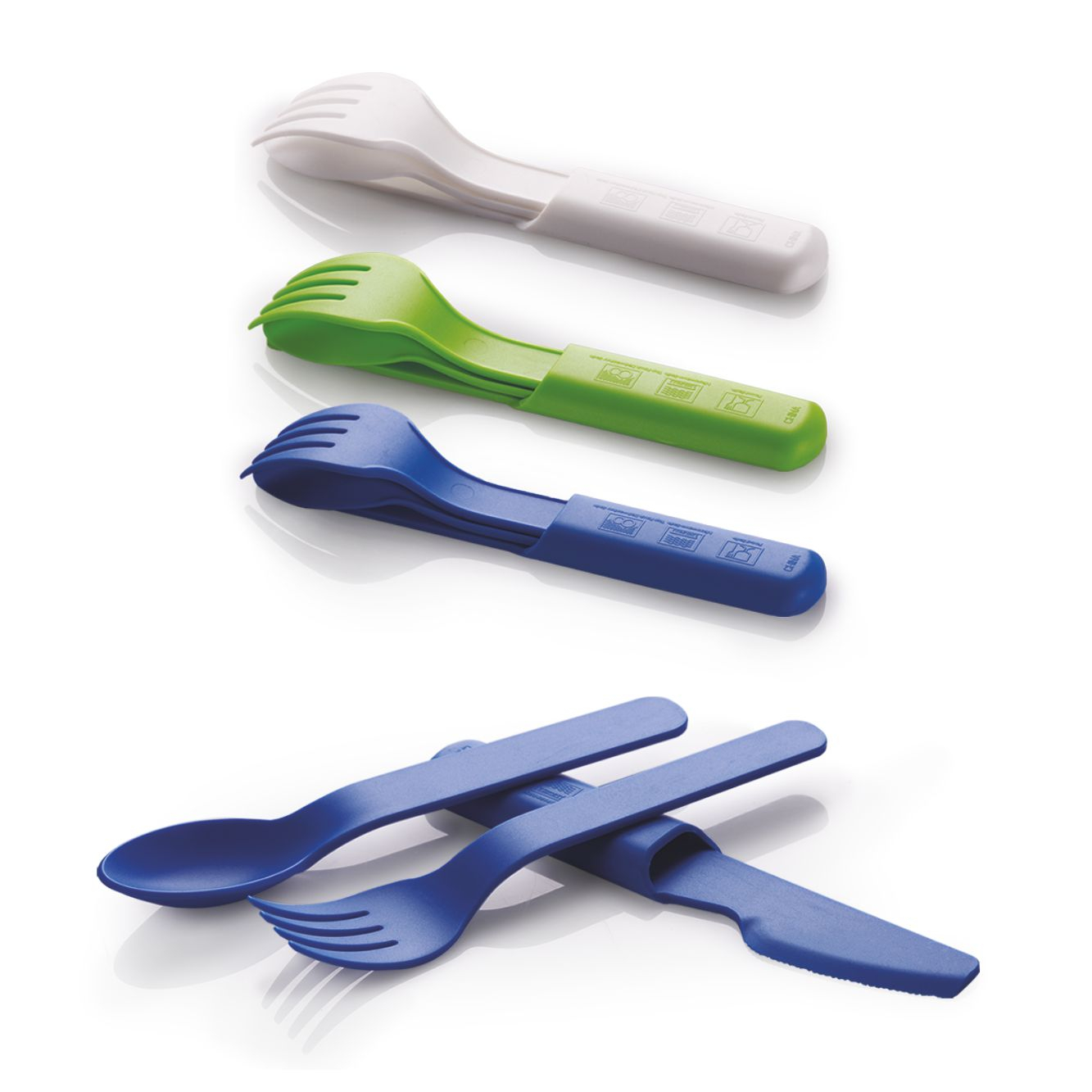 Set posate 3pz. in plastica. Colori: royal, bianco, verde. Confezione in polybag. Dimensioni cm. 16x2,5 Imballo: 200xcolore