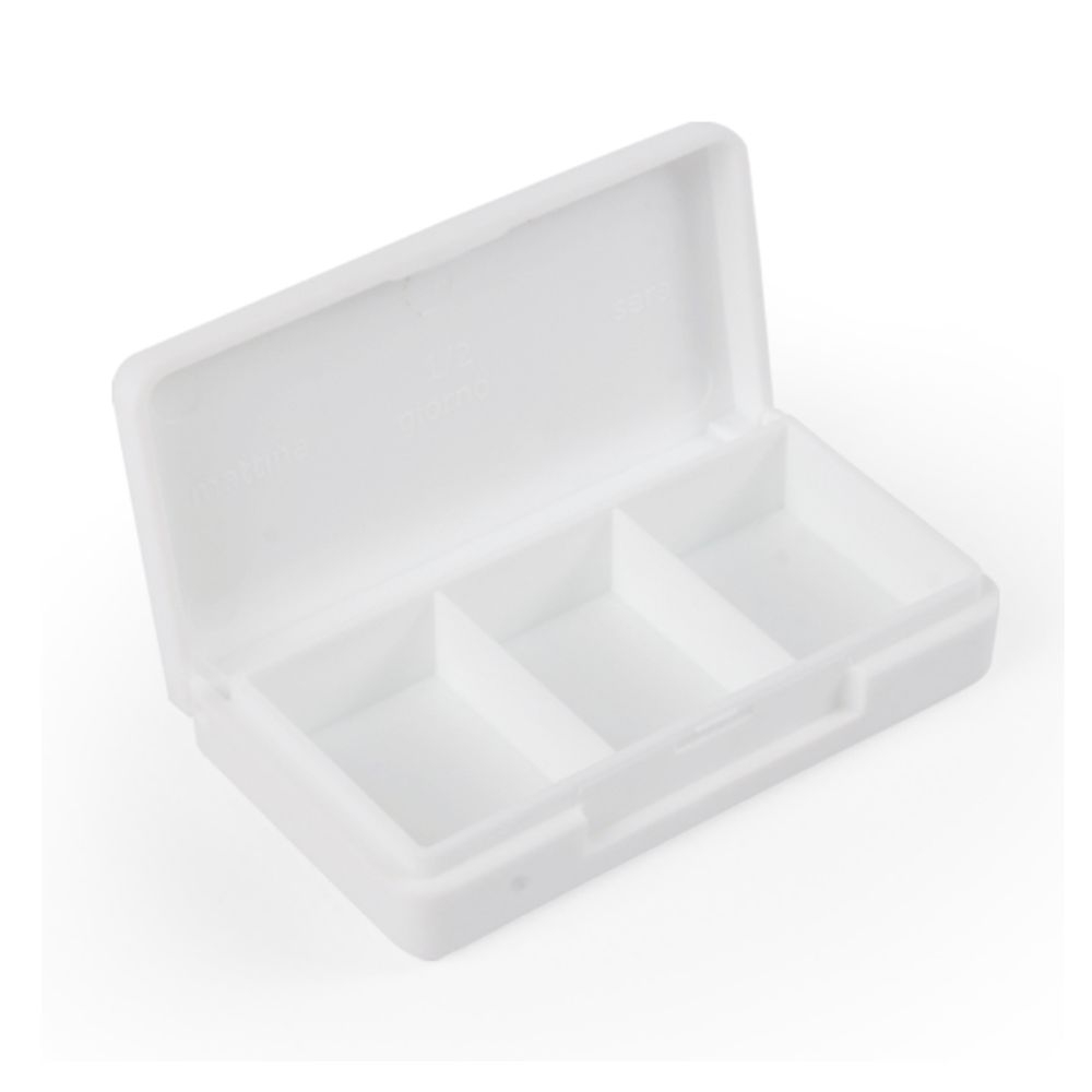 Portapillole in plastica 3 scomparti. Colore : unico. Confezione in polybag. Dimensioni cm. 6,5x3,3x1,5 Imballo: 200
