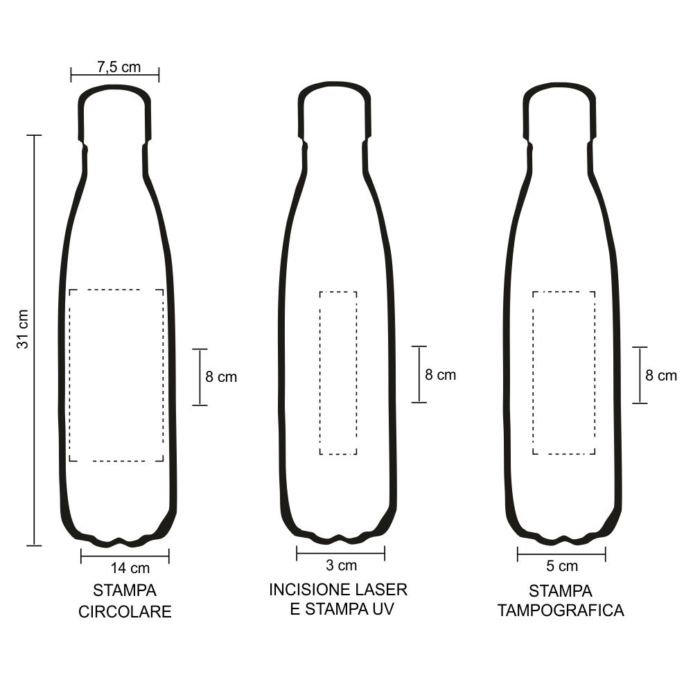 Borraccia doppia parete in Acciaio Inox 304, capacità: 750ml. - 12H caldo 24H freddo. - Dimensioni: Ø 7cm. - h 31cm. - Imballo: 50 - Borracce confezionate singolarmente con scatola