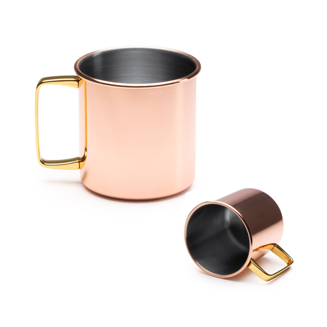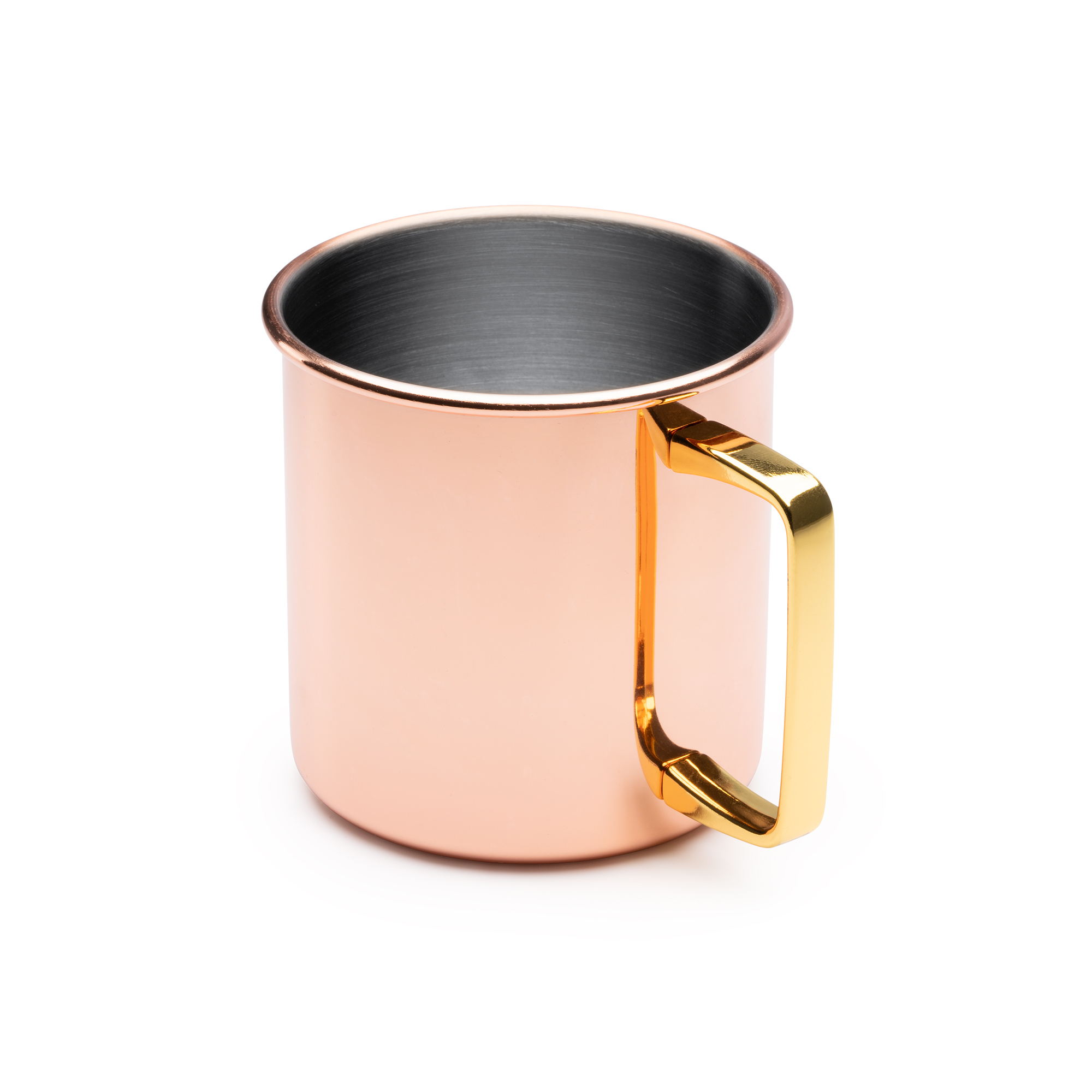 Tazza in acciaio inossidabile da 480ml con rivestimento esterno in rame e manico dorato. Il rivestimento esterno in rame contribuisce a mantenere più a lungo la temperatura delle bevande. Dimensioni: cm 9x9Ø