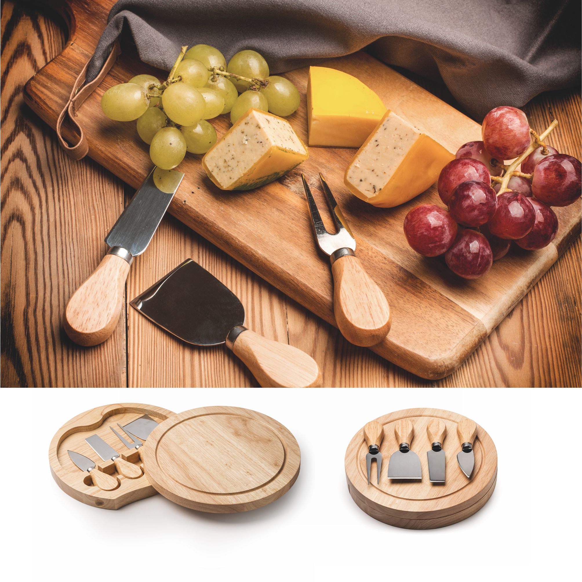 Set da formaggio con 4 utensili in acciaio inox e manico in legno. Presentato in una pratica custodia in legno con tagliere nella parte superiore. Dimansioni: cm 3,6 x ø 20. Confezione in astuccio. Imballo: 10pz.