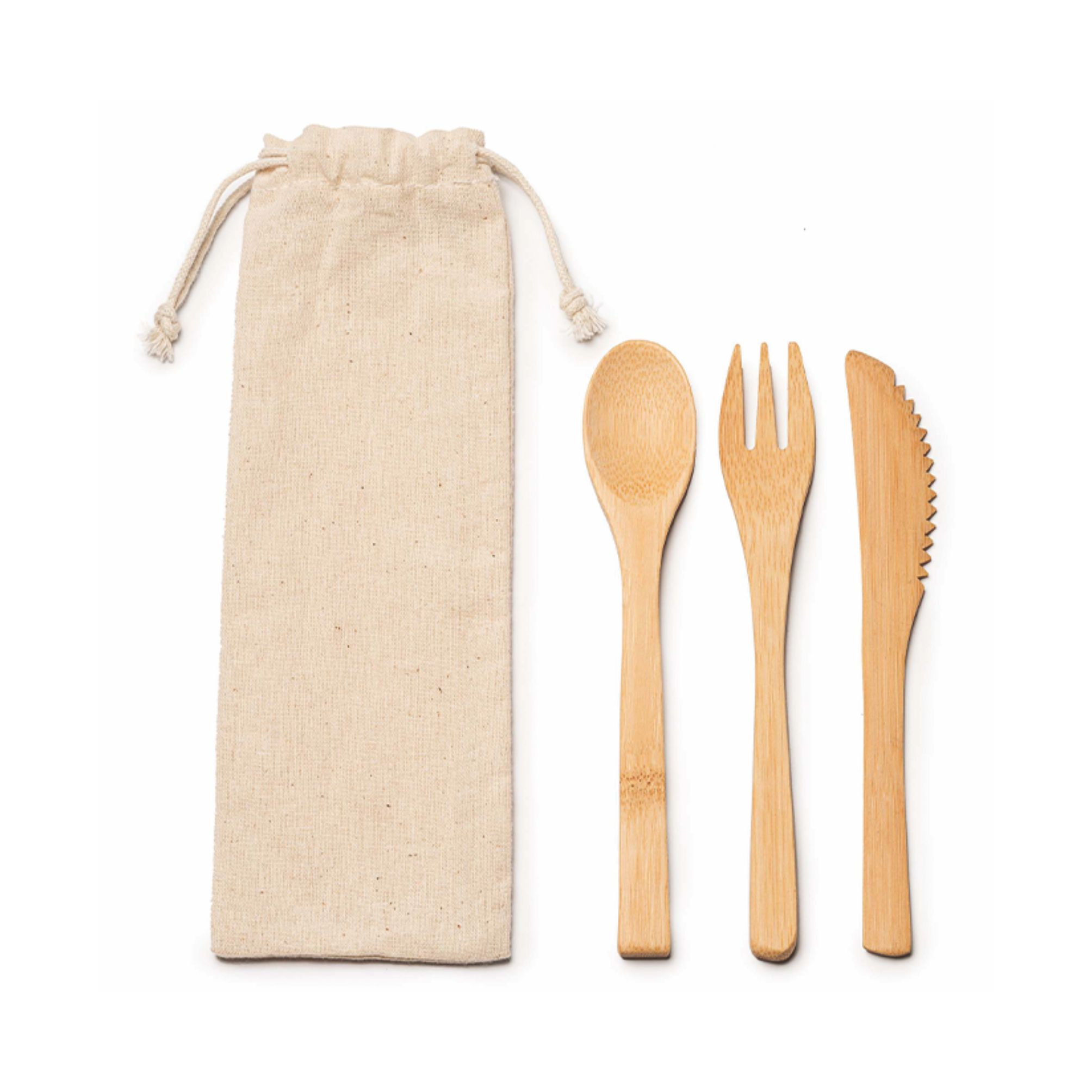 Set di posate in bamboo naturale. Confezione di cotone naturale con cordoncino. Include forchetta, coltello e cucchiaio. Dimansione: cm 6,5x1x22. Confezione in polybag. Imballo: 300pz.