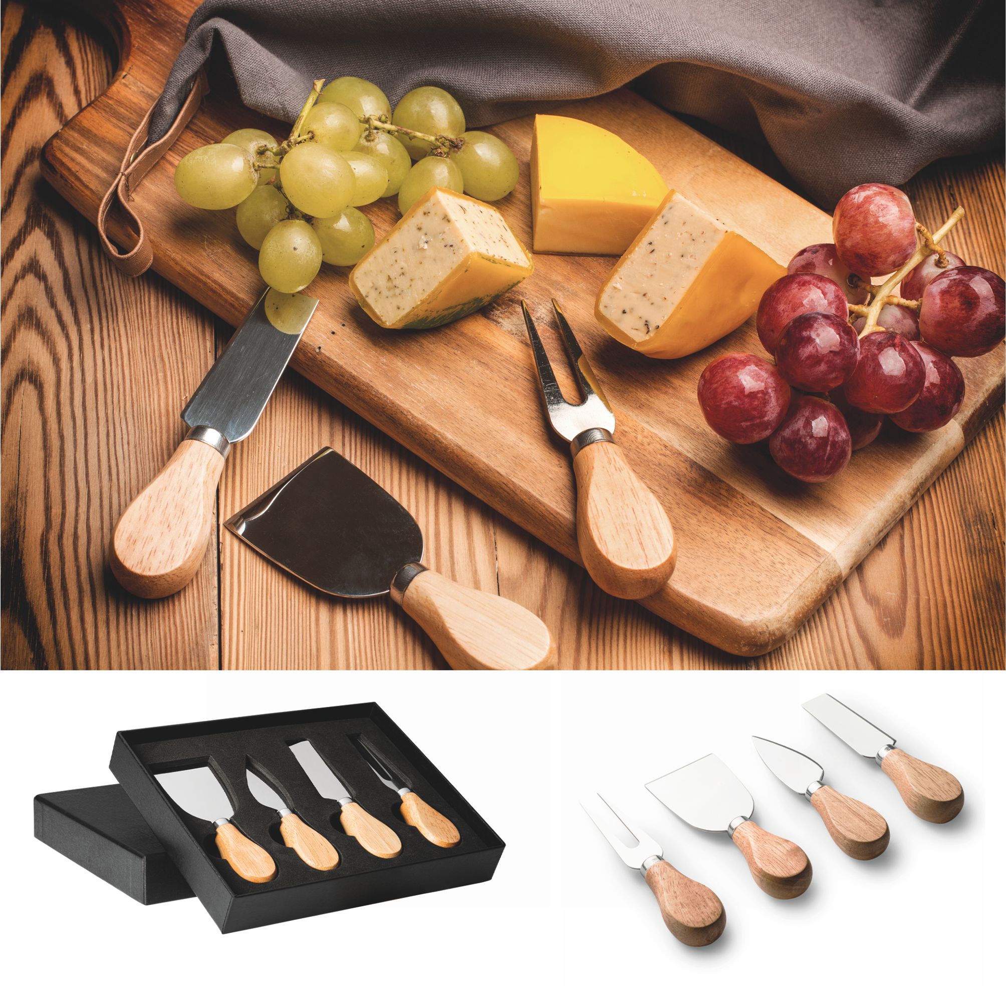 Set da formaggio con 4 utensili in acciaio inox e manico in legno. Presentato in un elegante cofanetto con interno imbottito. Dimansioni: cm 21,5x17,4x3,4. Confezione in astuccio. Imballo: 40pz.